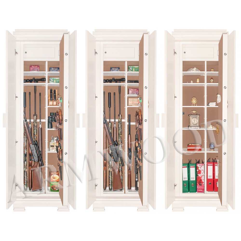 Внутри сейфа есть запираемое (патронное) отделение и вертикальная перегородка, которая делит внутреннее пространство сейфа на две половины. Внутри одной половины есть пять съёмных полок и съёмные деревянные ложементы на четыре ствола. Также там имеется съёмный боковой роликовый ложемент-зажим (производства Германии) с регулируемой высотой установки (для хранения 5-го ствола, либо для дополнительной фиксации оружия с оптикой). Внутри второй половины есть пять коротких съёмных полок и съёмные деревянные ложементы на два ствола.