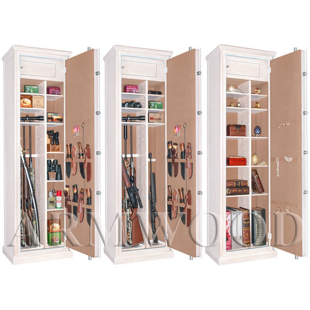 Внутри сейфа есть запираемое (патронное) отделение и вертикальная перегородка, которая делит внутреннее пространство сейфа на две половины. Внутри одной половины есть пять съёмных полок и съёмные деревянные ложементы на четыре ствола. Также там имеется съёмный боковой роликовый ложемент-зажим (производства Германии) с регулируемой высотой установки (для хранения 5-го ствола, либо для дополнительной фиксации оружия с оптикой). Внутри второй половины есть пять коротких съёмных полок и съёмные деревянные ложементы на два ствола.