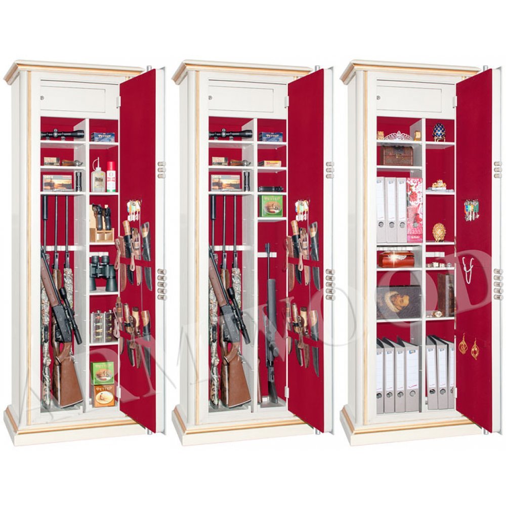 Внутри сейфа есть запираемое (патронное) отделение и вертикальная перегородка, которая делит внутреннее пространство сейфа на две половины. Внутри одной половины есть пять съёмных полок и съёмные деревянные ложементы на четыре ствола. Также там имеется съёмный боковой роликовый ложемент-зажим (производства Германии) с регулируемой высотой установки (для хранения 5-го ствола, либо для дополнительной фиксации оружия с оптикой). Внутри второй половины есть пять коротких съёмных полок и съёмные деревянные ложементы на два ствола.