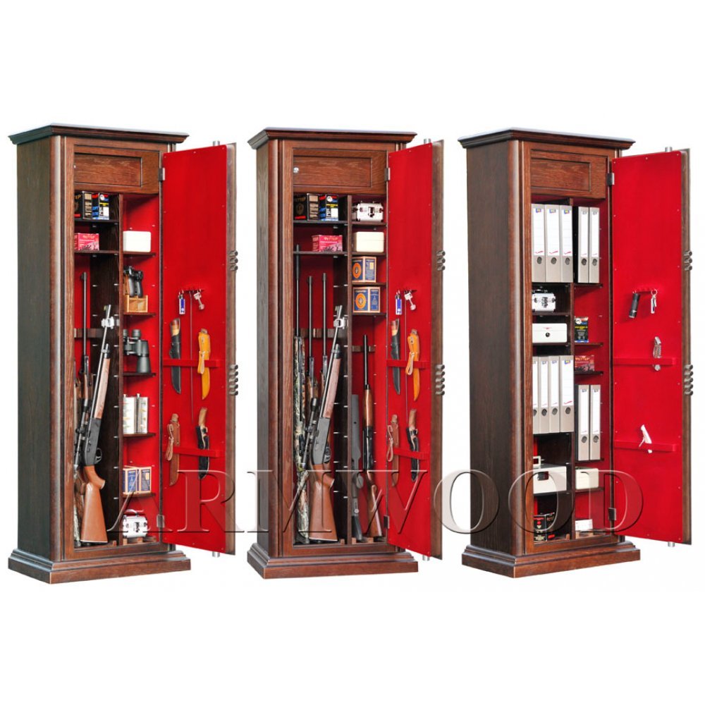Внутри сейфа есть запираемое (патронное) отделение и вертикальная перегородка, которая делит внутреннее пространство сейфа на две половины. Внутри одной половины есть пять съёмных полок и съёмные деревянные ложементы на четыре ствола. Также там имеется съёмный боковой роликовый ложемент-зажим (производства Германии) с регулируемой высотой установки (для хранения 5-го ствола, либо для дополнительной фиксации оружия с оптикой). Внутри второй половины есть пять коротких съёмных полок и съёмные деревянные ложементы на два ствола.