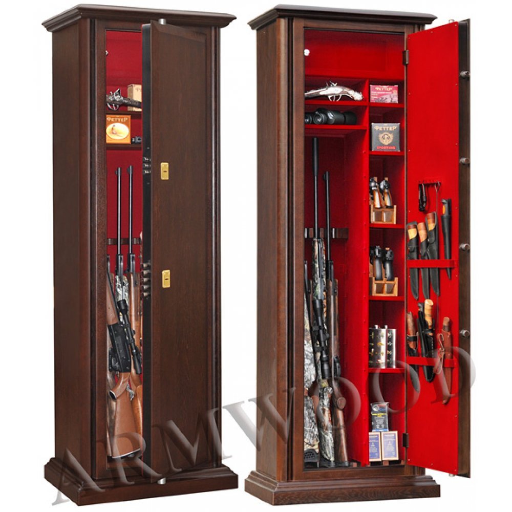 Внутри сейфа есть запираемое (патронное) отделение и вертикальная перегородка, которая делит внутреннее пространство сейфа на две половины. Внутри одной половины есть пять съёмных полок и съёмные деревянные ложементы на четыре ствола. Также там имеется съёмный боковой роликовый ложемент-зажим (производства Германии) с регулируемой высотой установки (для хранения 5-го ствола, либо для дополнительной фиксации оружия с оптикой). Внутри второй половины есть пять коротких съёмных полок и съёмные деревянные ложементы на два ствола.