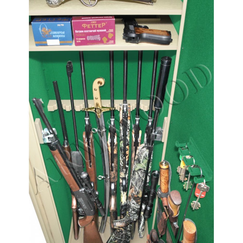 Внутри сейфа запираемое (патронное) отделение, 5 съёмных полок с регулируемой высотой установки и съёмные деревянные ложементы. Также на боковых стенках имеются два съёмных роликовых зажима (производства Германии) с регулируемой высотой установки. Эти зажимы используются в том числе и для удобного хранения оружия с оптикой.