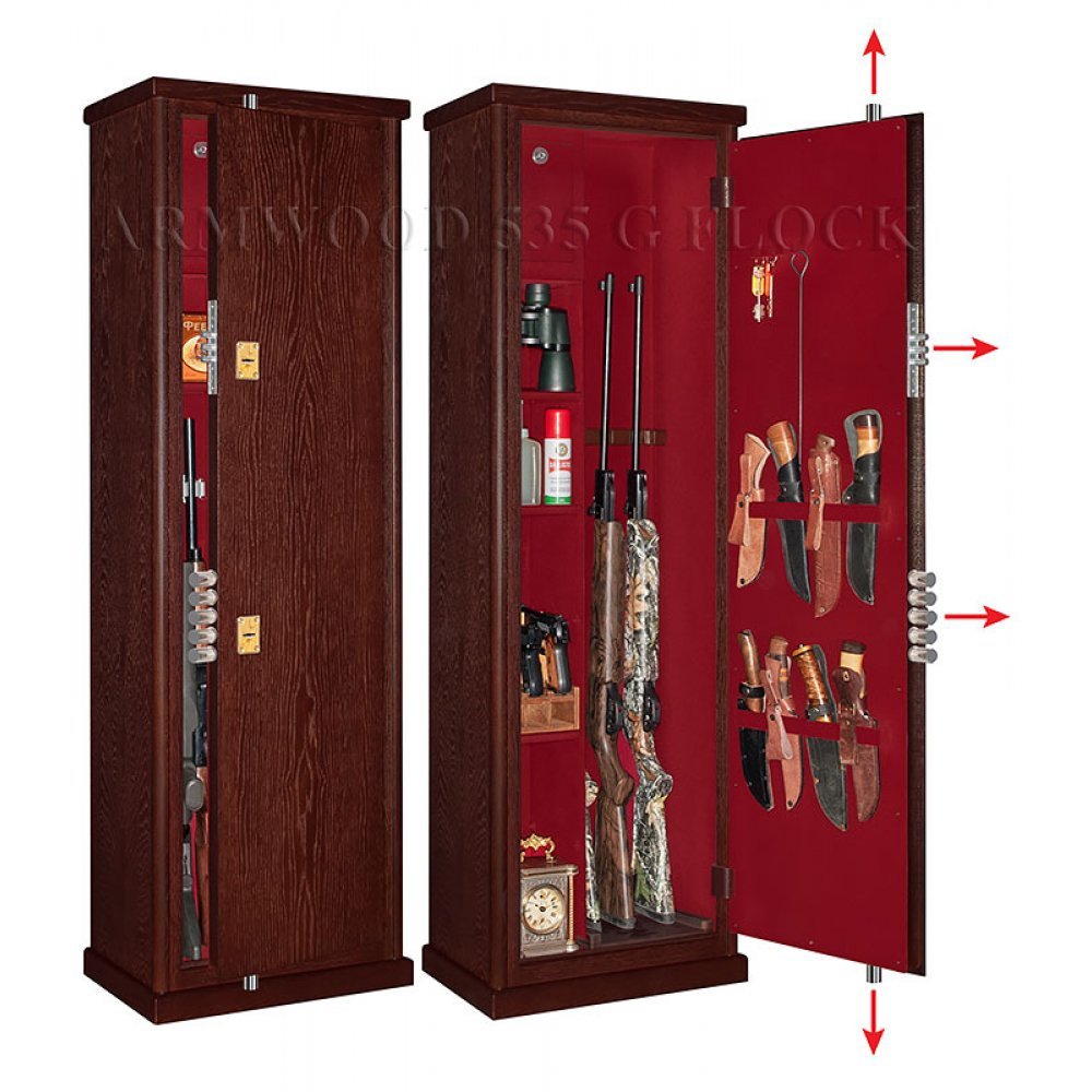 Имеются различные варианты отделки натуральным дубом сейфов серии Armwood (под различную мебель). Возможна поставка данного сейфа в исполнении универсальный сейф. В этом случае сейф поставляется с дополнительными полками и может использоваться не только как оружейный сейф, но и как личный и офисный сейф.
