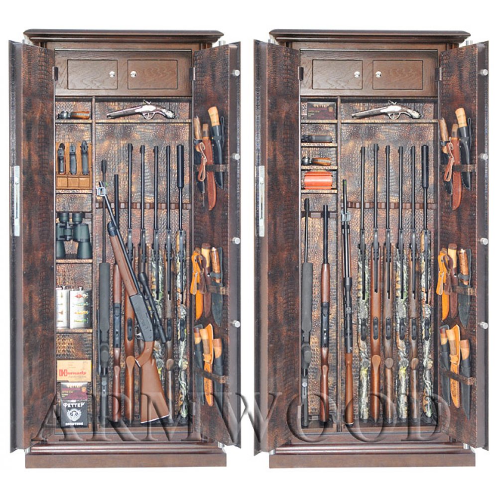 Внутри сейфа есть два запираемых (патронных) отделений и вертикальная перегородка, которая делит внутреннее пространство сейфа на две половины. Внутри одной половины есть две съёмные полки и деревянные ложементы на семь стволов. Также там имеется съёмный боковой роликовый ложемент-зажим (производства Германии) с регулируемой высотой установки (для хранения 8-го ствола, либо для дополнительной фиксации оружия с оптикой). Внутри второй половины есть четыре короткие съёмные полки и съёмные деревянные ложементы на два ствола.