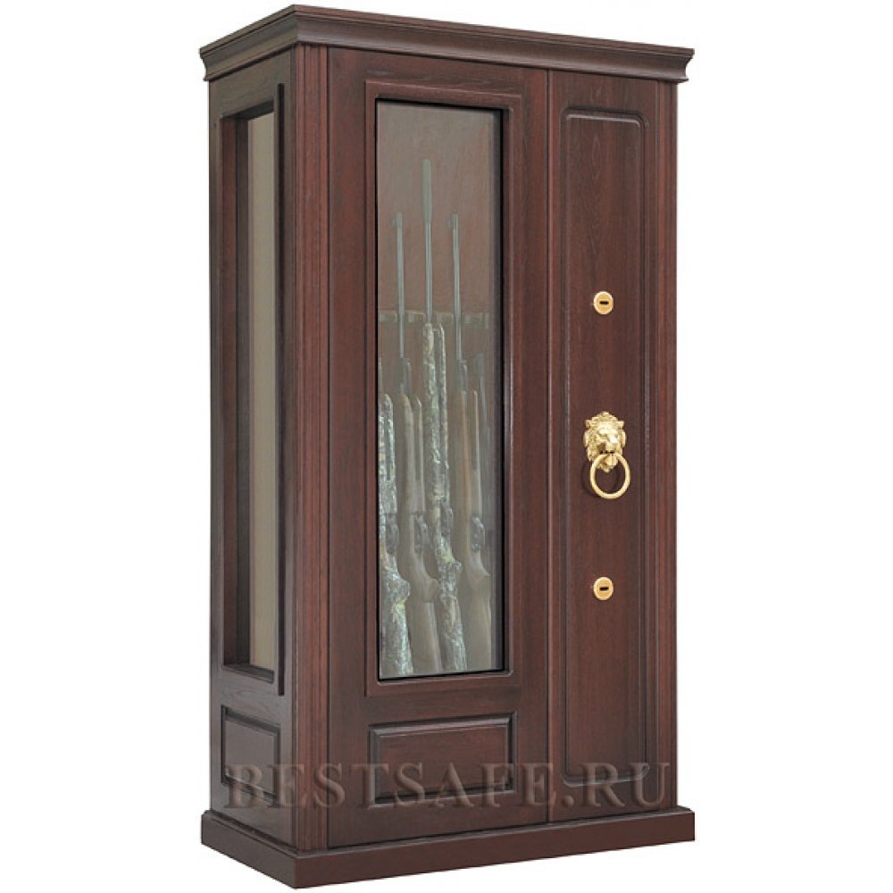 Полностью удовлетворяет требованиям МВД. Двухстворчатый оружейный сейф. Наружная поверхность сейфа отделана массивом ценных пород дерева (в базовом варианте массив дуба). Имеются различные варианты цвета деревянной отделки, а так же возможность изготовления по образцу Вашей мебели либо по нашему каталогу образцов дерева (всего более 15-и вариантов). Внутренняя поверхность сейфа отделана массивом ценных пород дерева и искусственным ковровым покрытием. Деревянные ложементы ручной работы. Сейф оборудован бронестеклами 2класса пулестойкости и подсветкой галогенными светильниками.