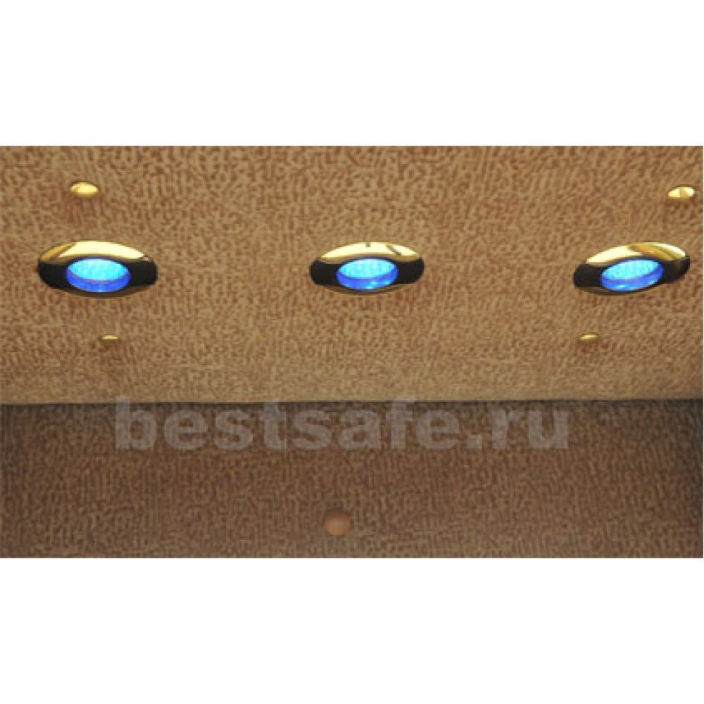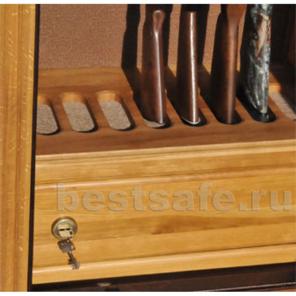 Полностью удовлетворяет требованиям МВД. Наружная поверхность сейфа отделана массивом ценных пород дерева (в базовом варианте массив дуба). Имеются различные варианты цвета деревянной отделки, а так же возможность изготовления по образцу Вашей мебели либо по нашему каталогу образцов дерева (всего более 15-и вариантов). Внутренняя поверхность сейфа отделана массивом ценных пород дерева и искусственным ковровым покрытием. Деревянные ложементы ручной работы. Сейф оборудован бронестеклами 2класса пулестойкости и подсветкой галогенными светильниками.