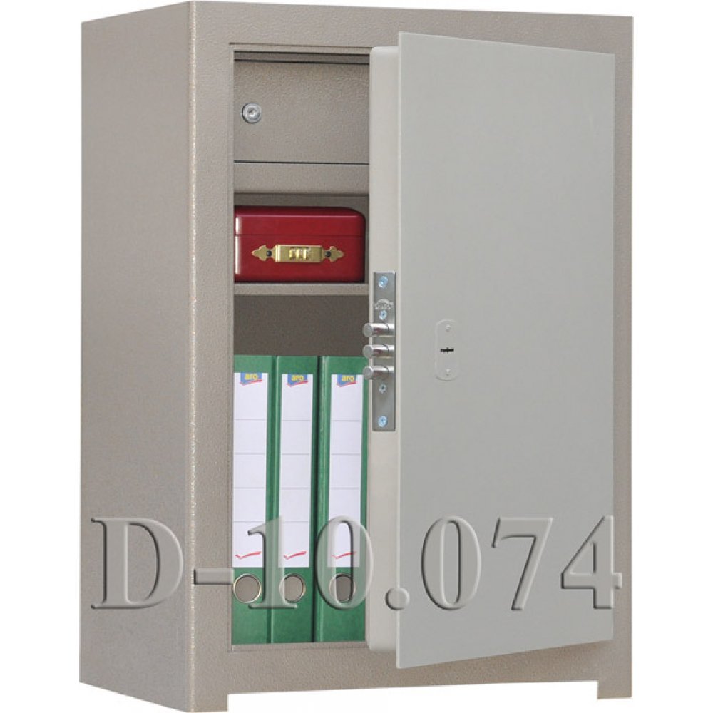Внутри сейфа запираемое кассовое отделение и полка, под которой свободно размещаются папки типа Корона