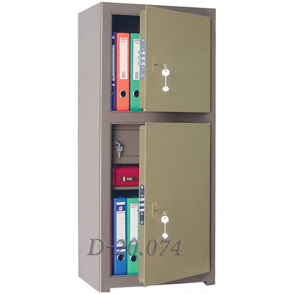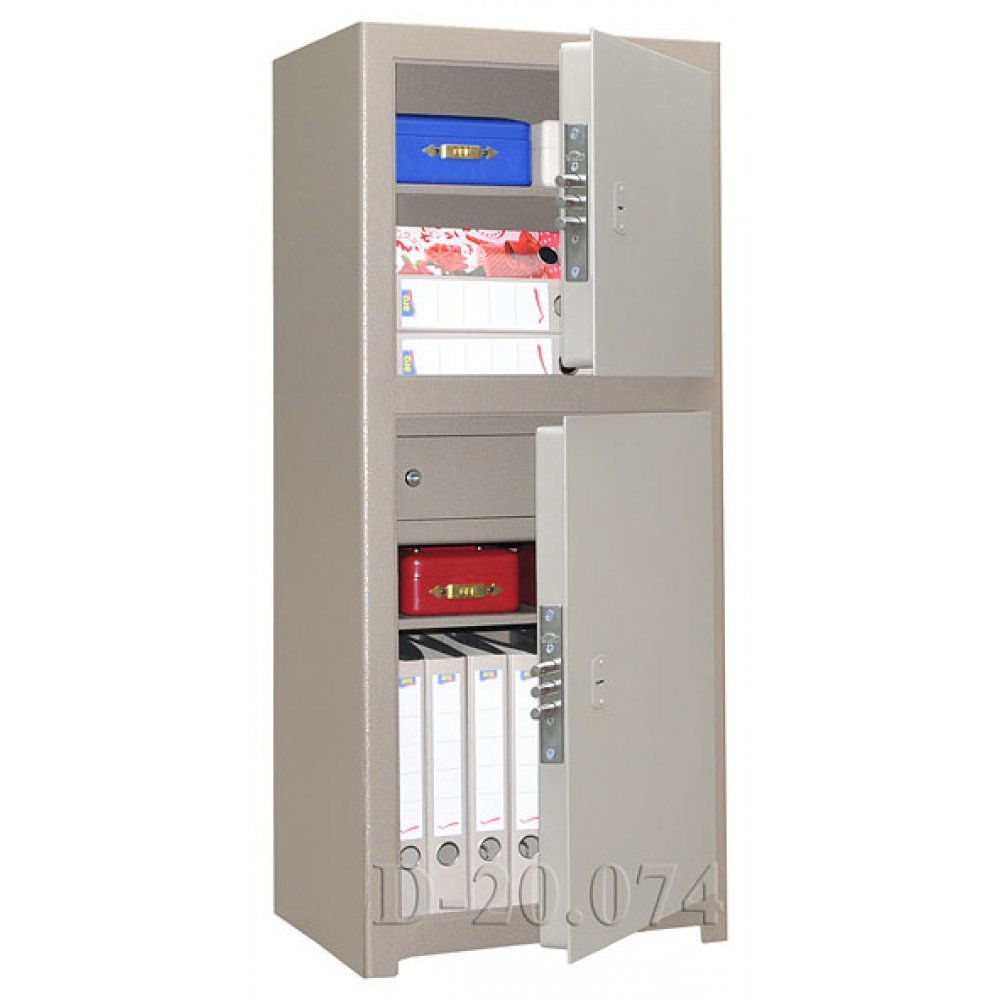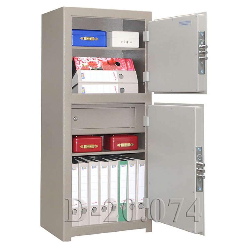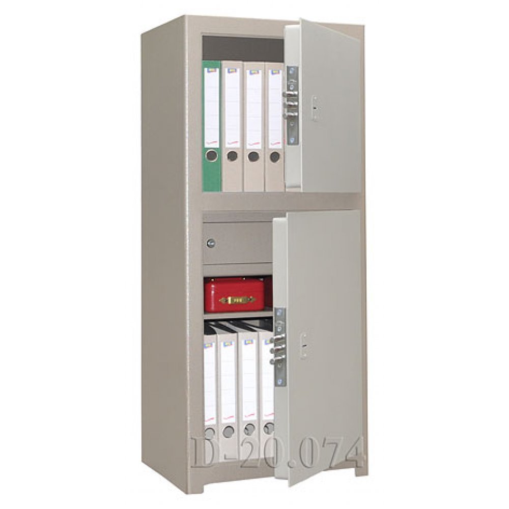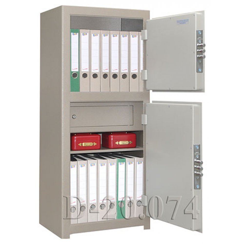Верхняя секция оборудована съемной регулируемой по высоте полкой, в нижней секции запираемое кассовое отделение и полка. Помещаются папки типа Корона.