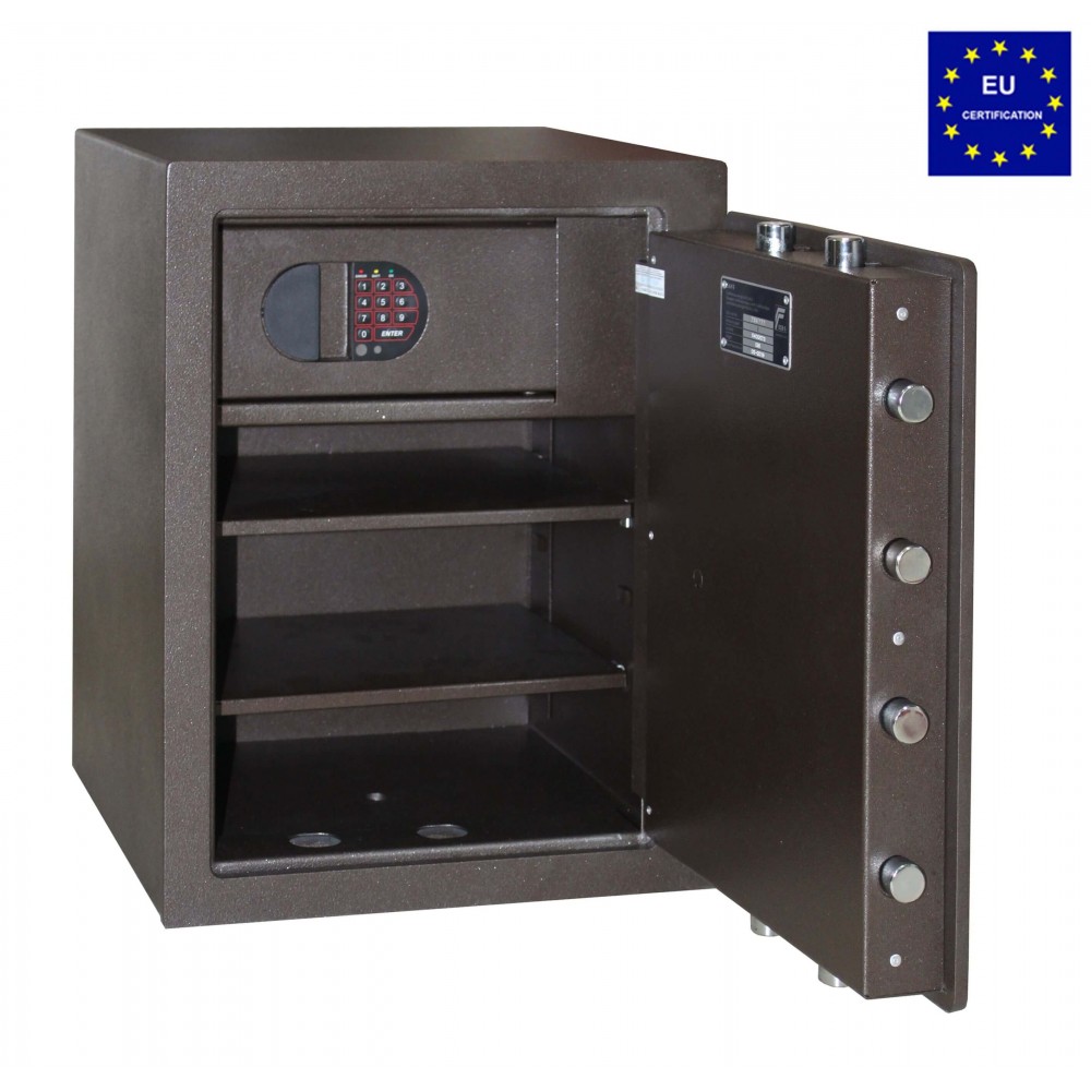 Производитель настоятельно рекомендует крепить сейф, для создания проблем злоумышленникам. Для этого в конструкции предусмотрены отверстия в пол и к задней стенке. В комплекте идет один сертифицированный анкерный болт. Одна съёмная полка. В сейфе, в верхней части установлен трейзер (ящик для ценностей), запираемый на отдельный электронный замок. По вашему желанию возможно произвести внешнюю и внутреннюю отделку данного сейфа в лак по RAL и бархат по каталогу.
