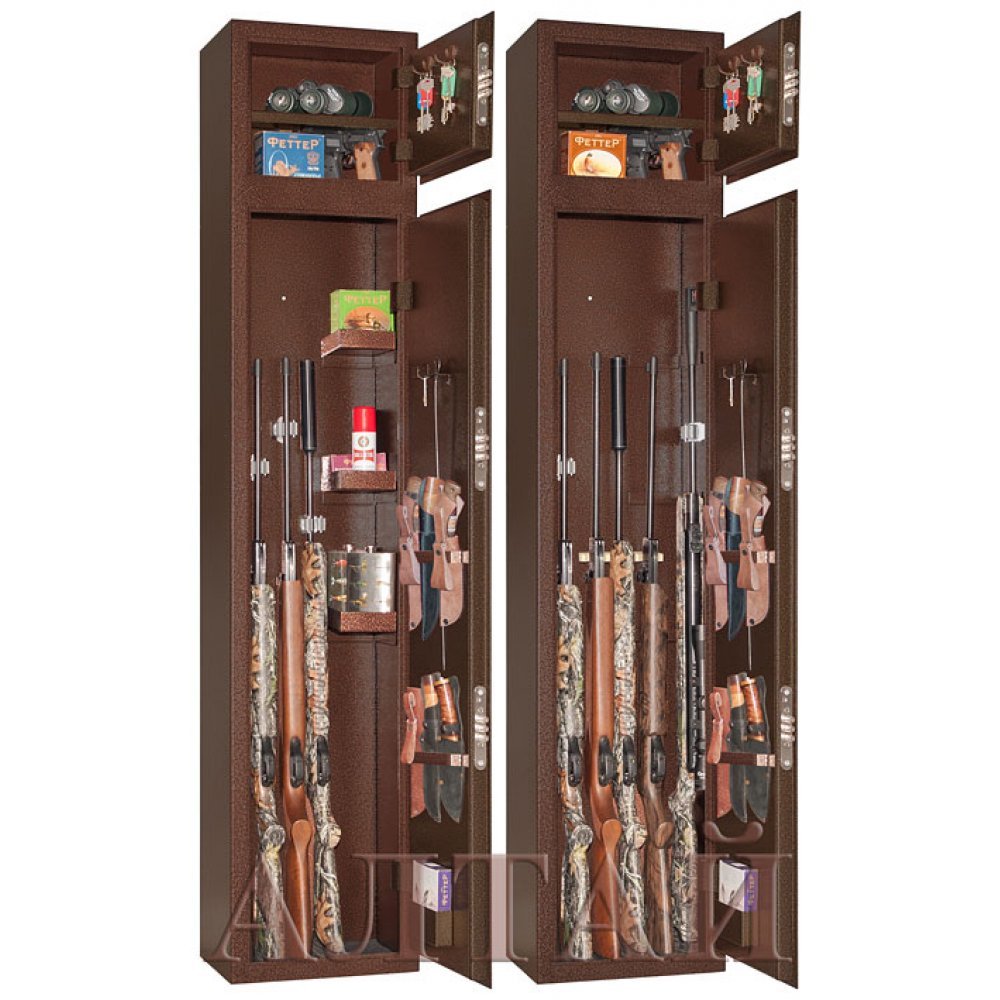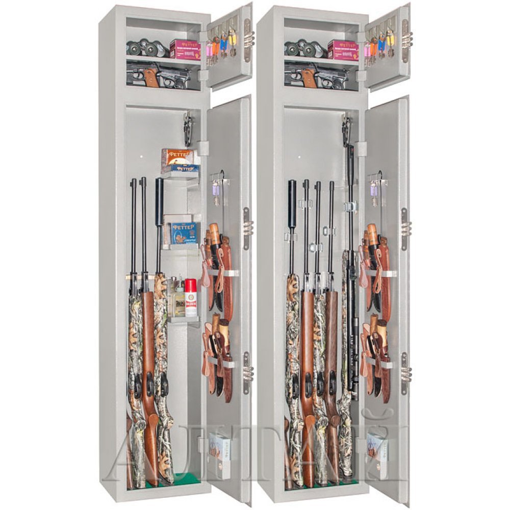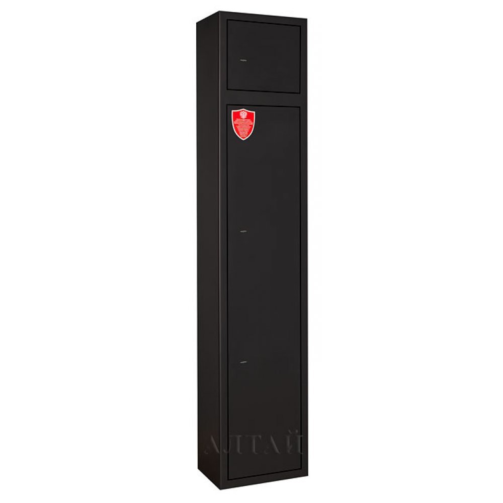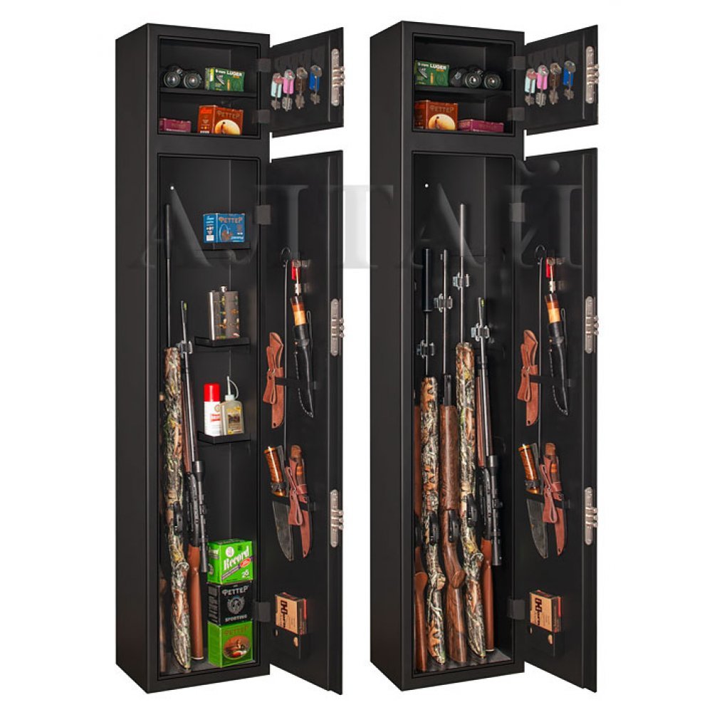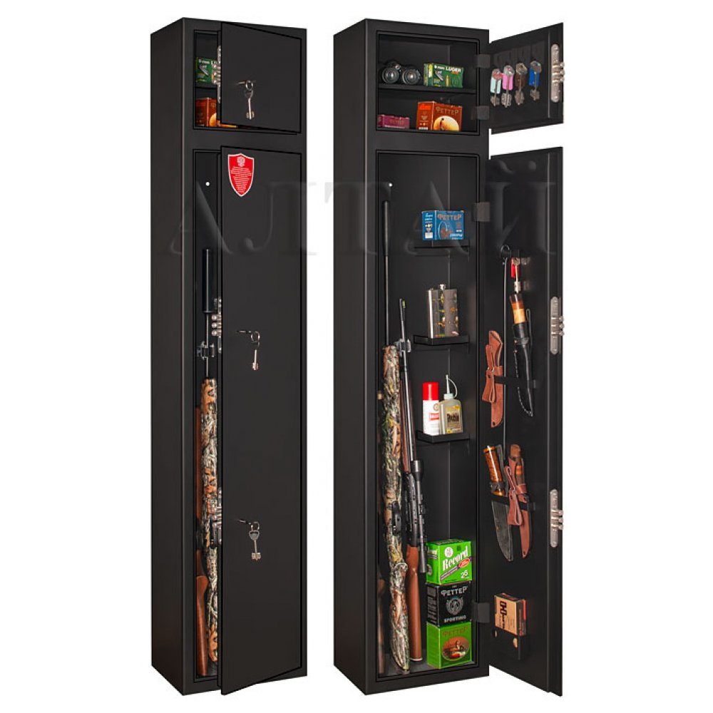 Двухсекционный оружейный сейф. Сейф полностью удовлетворяет требованиям МВД и Росгвардии к хранению оружия физическими лицами. Оснащен тремя сейфовыми замками второго класса. Оборудован удобными ложементами для хранения оружия. На внутренней поверхности двери сейфа имеются крючки, и рамки для хранения ножей. Имеются анкерные отверстия на задней стенке сейфа для крепления к стене. Прочная порошковая краска защищает сейф от коррозии.