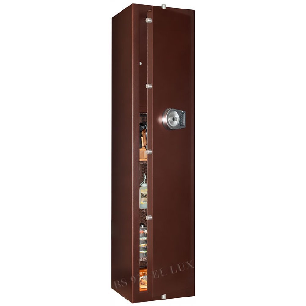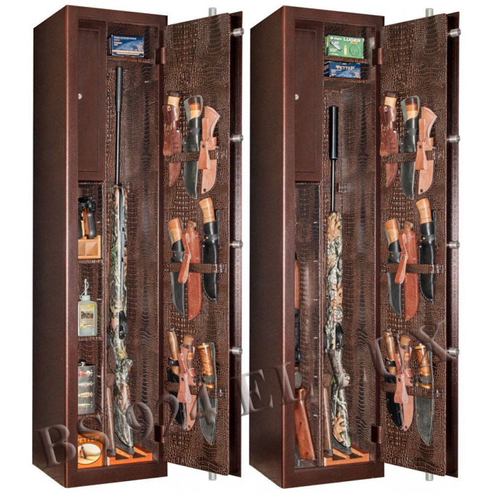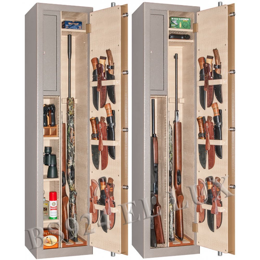 Сейф полностью удовлетворяет требованиям МВД и Росгвардии к хранению оружия физическими и юридическими лицами. Толщина металла не менее 3 мм. Оснащен электронным сейфовым замком. Оборудован удобными ложементами для хранения оружия. Имеются анкерные отверстия на задней стенке сейфа для крепления к стене. Внутри сейф полностью отделан кожей.