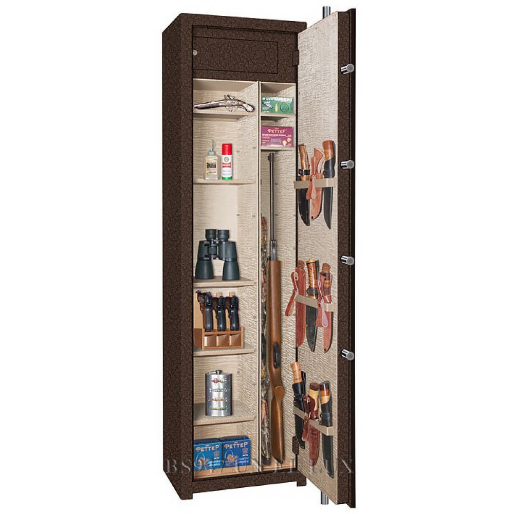 Внутри узкой области пять съёмных полок с регулируемой высотой установки, а также деревянные нижние и верхние ложементы на 2 ствола.