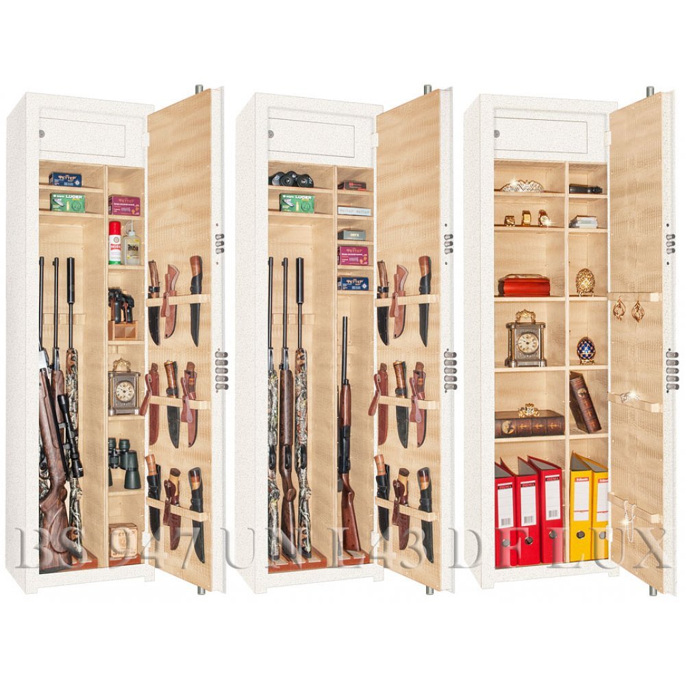 Внутри широкой области пять съёмных полок с регулируемой высотой установки, а также деревянные нижние и верхние фигурные ложементы на 4 ствола. Также в широкой области имеется роликовый ложемент-зажим (производства Германии) с регулируемой высотой установки. Этот ложемент может быть использован для хранения в широкой области пятого ствола либо для дополнительной боковой фиксации оружия с оптикой.