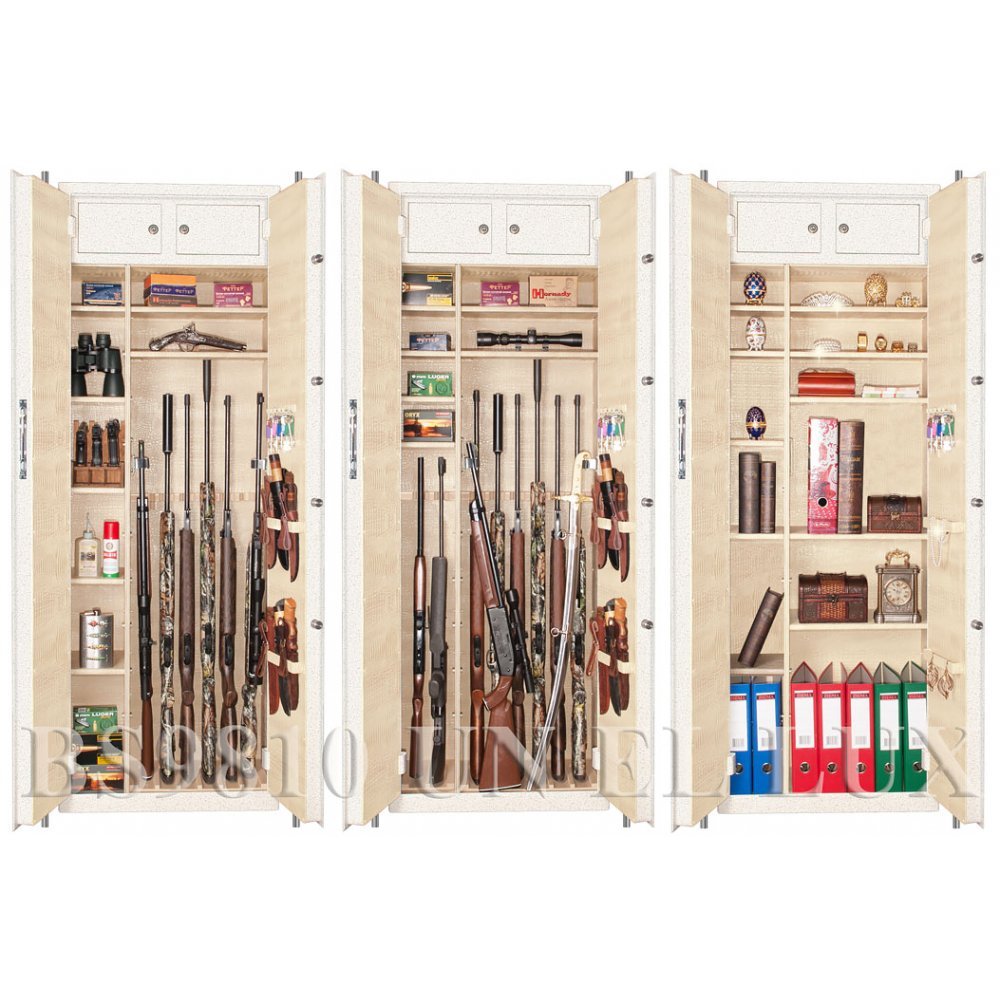 Универсальный сейф, может использоваться как оружейный сейф либо как личный (офисный) сейф. Сейф полностью удовлетворяет требованиям МВД и Росгвардии к хранению оружия физическими и юридическими лицами. Толщина металла не менее 3 мм. Оснащен электронным сейфовым замком. Оборудован удобными ложементами для хранения оружия. Имеются анкерные отверстия на задней стенке сейфа для крепления к стене. Внутри сейф полностью отделан кожей.