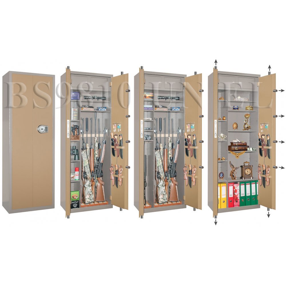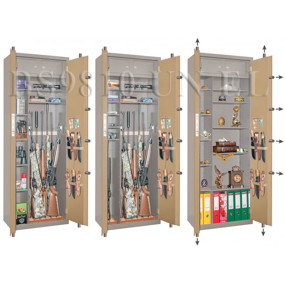 Универсальный сейф, может использоваться как оружейный сейф либо как личный или офисный. Сейф полностью удовлетворяет требованиям МВД и Росгвардии к хранению оружия физическими и юридическими лицами. Толщина металла не менее 3 мм. Оснащен электронным сейфовым замком. Оборудован удобными ложементами для хранения оружия. Имеются анкерные отверстия на задней стенке сейфа для крепления к стене.