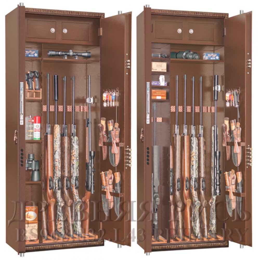 Высота хранимых стволов 1290 либо 1490 мм, в зависимости от модификации - обязательно уточняйте это при заказе. По желанию заказчика возможны дополнительные опции на внутренних поверхностях дверей: держатели для шомполов, крючки, лотки, держатели для ножей и т.п.