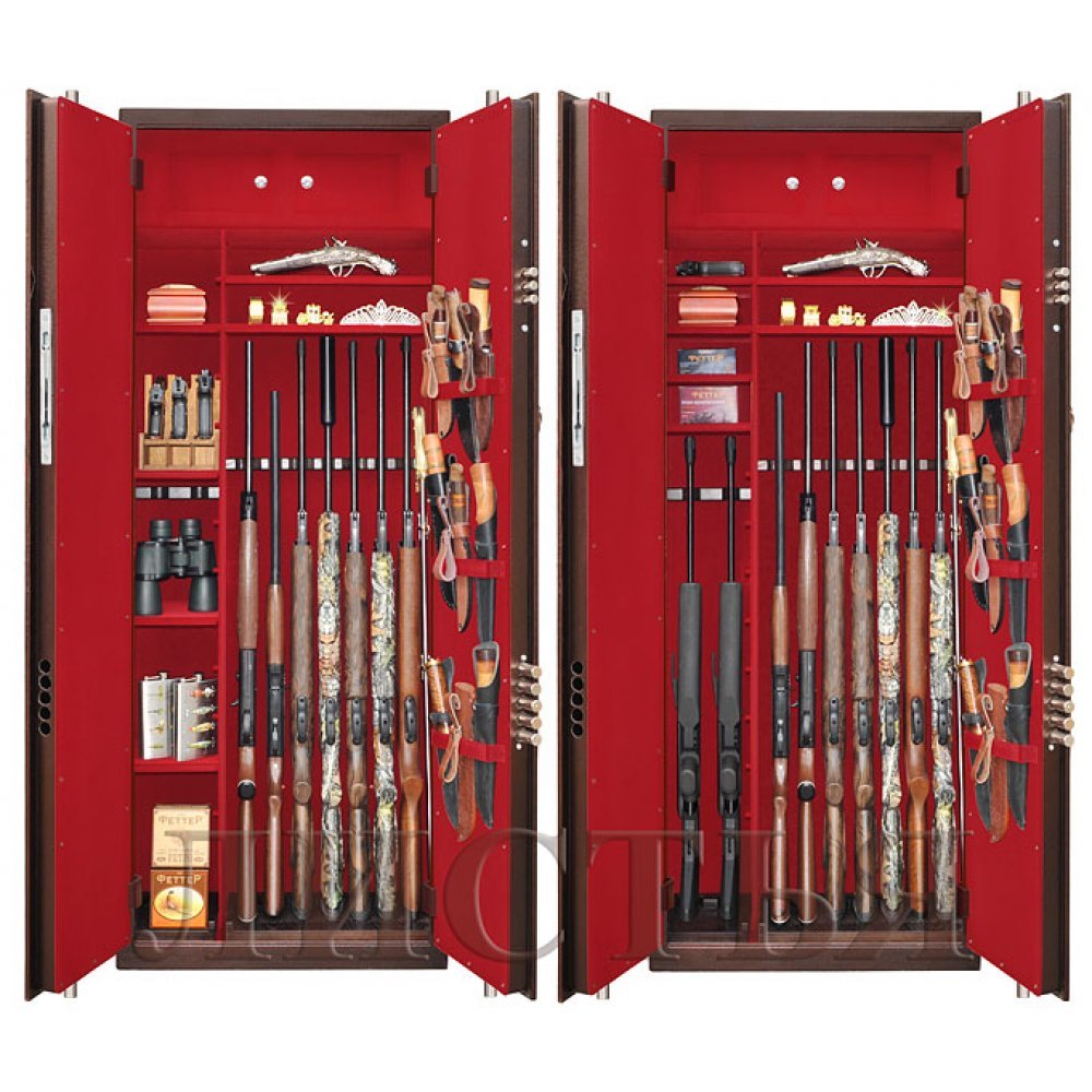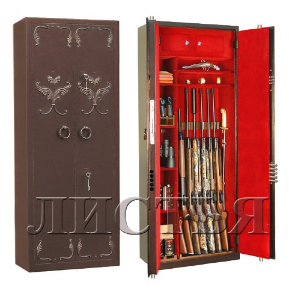 Высота хранимых стволов 1290 либо 1490 мм, в зависимости от модификации - обязательно уточняйте это при заказе. По желанию заказчика возможны дополнительные опции на внутренних поверхностях дверей: держатели для шомполов, крючки, лотки, держатели для ножей и т.п.