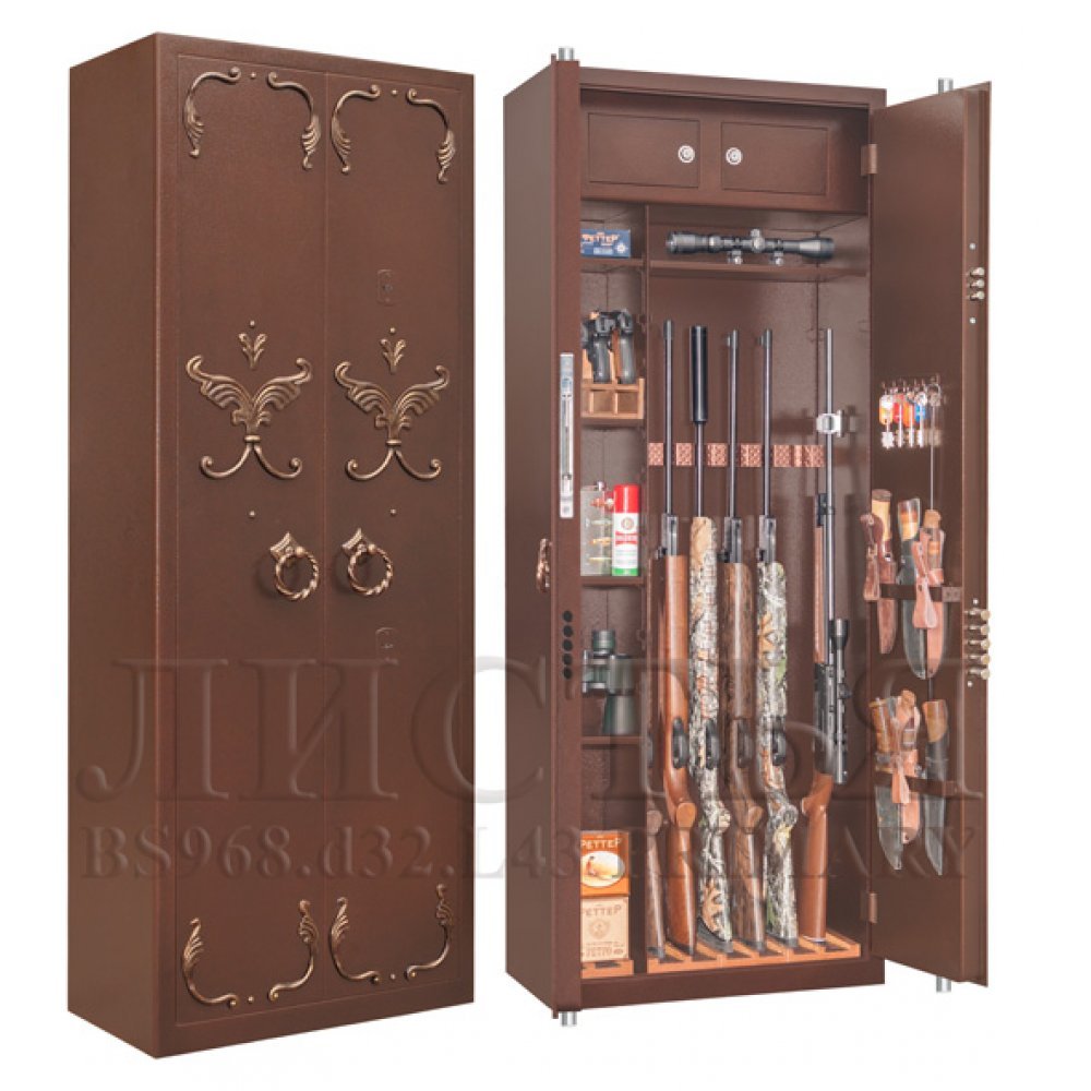 Высота хранимых стволов 1290 либо 1490 мм, в зависимости от модификации - обязательно уточняйте это при заказе. По желанию заказчика возможны дополнительные опции на внутренних поверхностях дверей: держатели для шомполов, крючки, лотки, держатели для ножей и т.п.