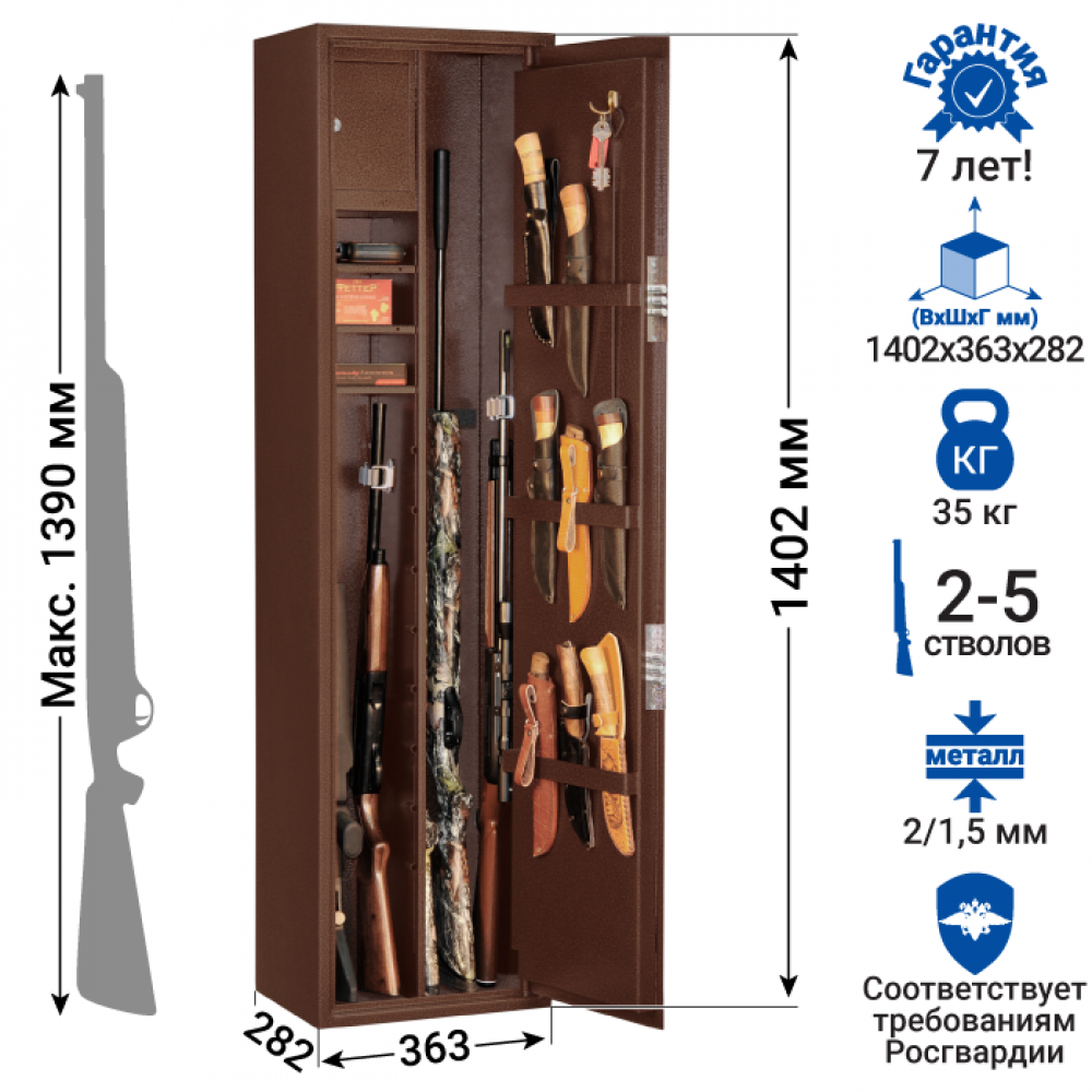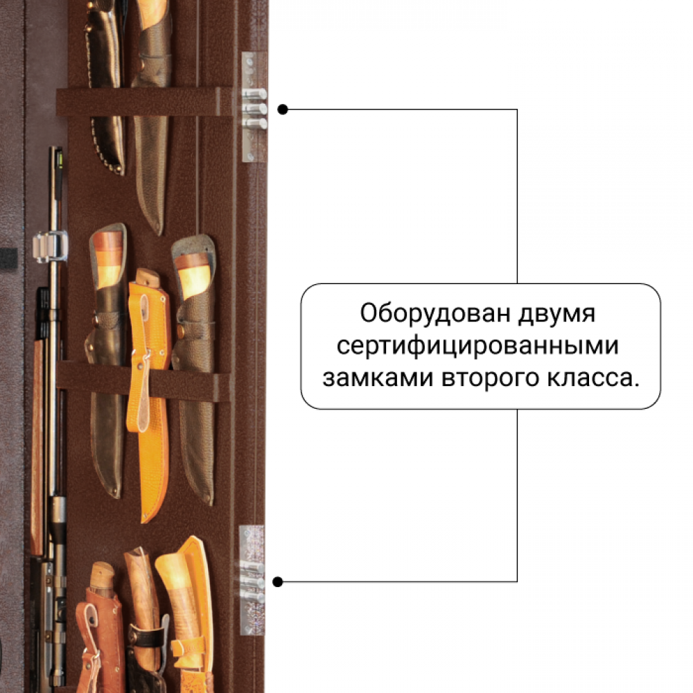 Сейф полностью удовлетворяет требованиям МВД и Росгвардии к хранению оружия физическими лицами. Оснащен двумя сейфовыми замками второго класса. Оборудован удобными ложементами для хранения оружия. На внутренней поверхности двери сейфа имеются крючки, и рамки для хранения ножей. Имеются анкерные отверстия на задней стенке сейфа для крепления к стене. Прочная порошковая краска защищает сейф от коррозии.