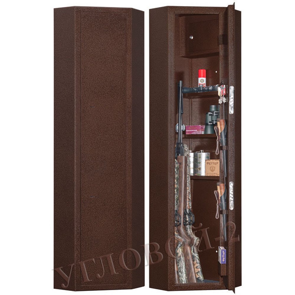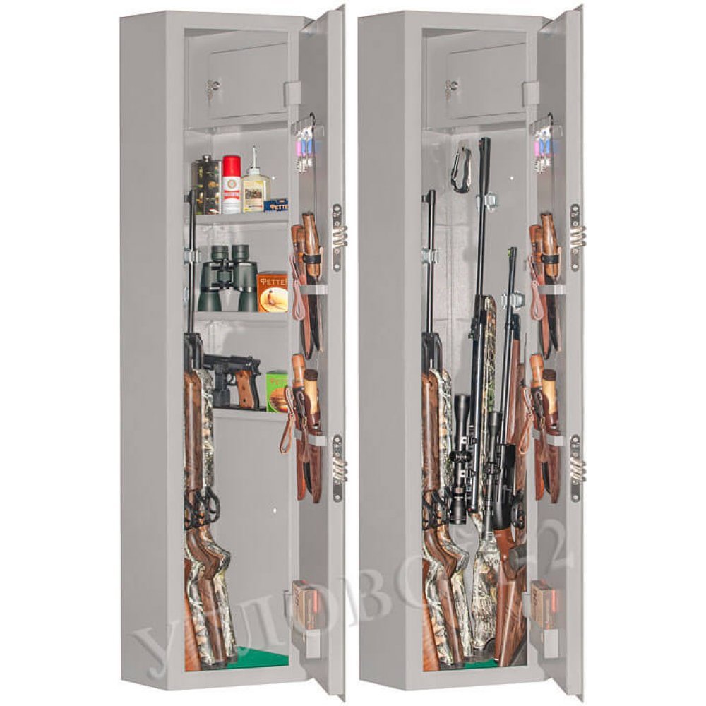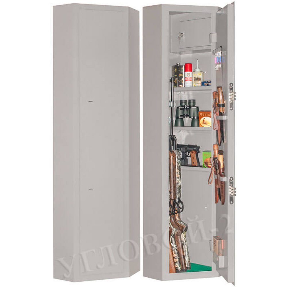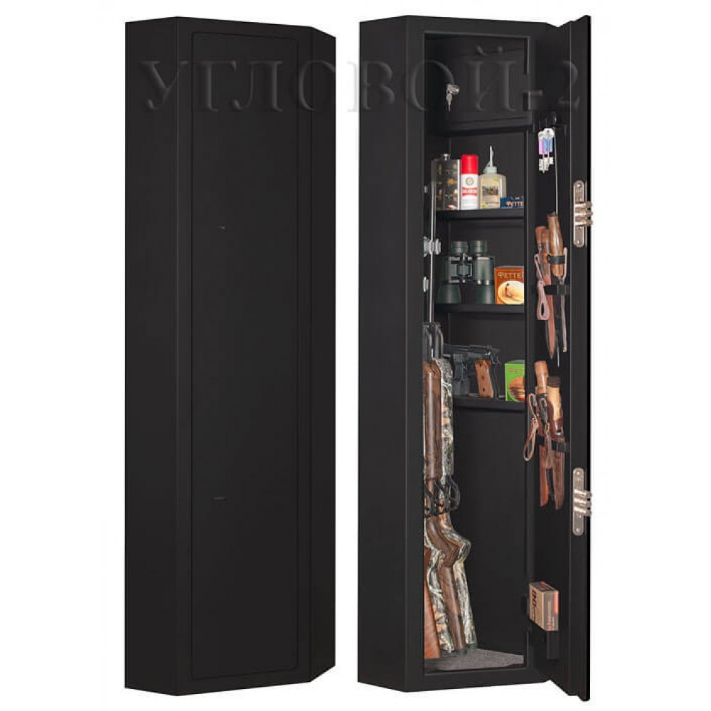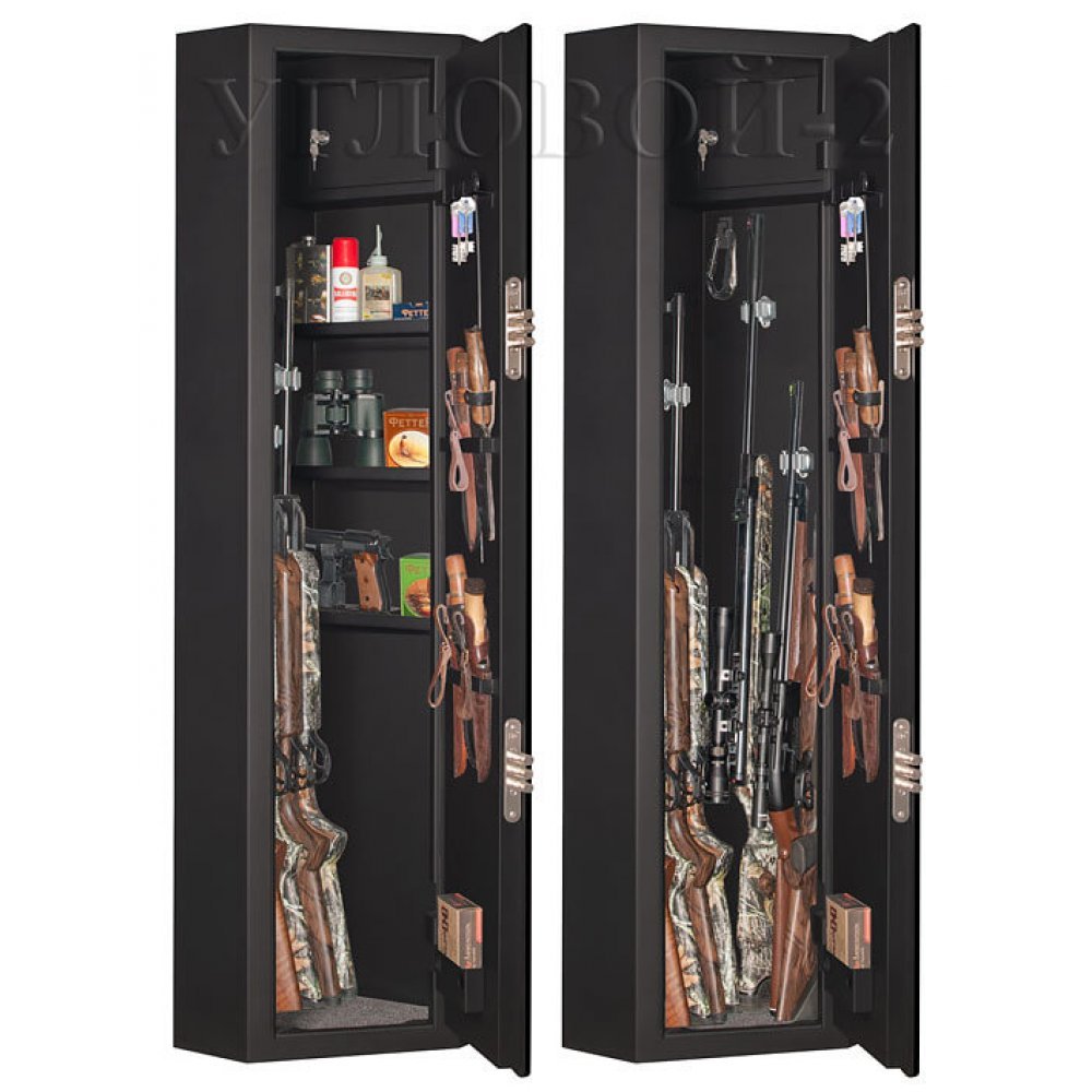 Удобен для установки в углу помещения. Сейф полностью удовлетворяет требованиям МВД и Росгвардии к хранению оружия физическими и юридическими лицами. Толщина металла не менее 2 мм. Оснащен двумя сейфовыми замками второго класса. Оборудован удобными ложементами для хранения оружия. На внутренней поверхности двери сейфа имеются крючки, и рамки для хранения ножей. Имеются анкерные отверстия на задней стенке сейфа для крепления к стене. Прочная порошковая краска защищает сейф от коррозии.
