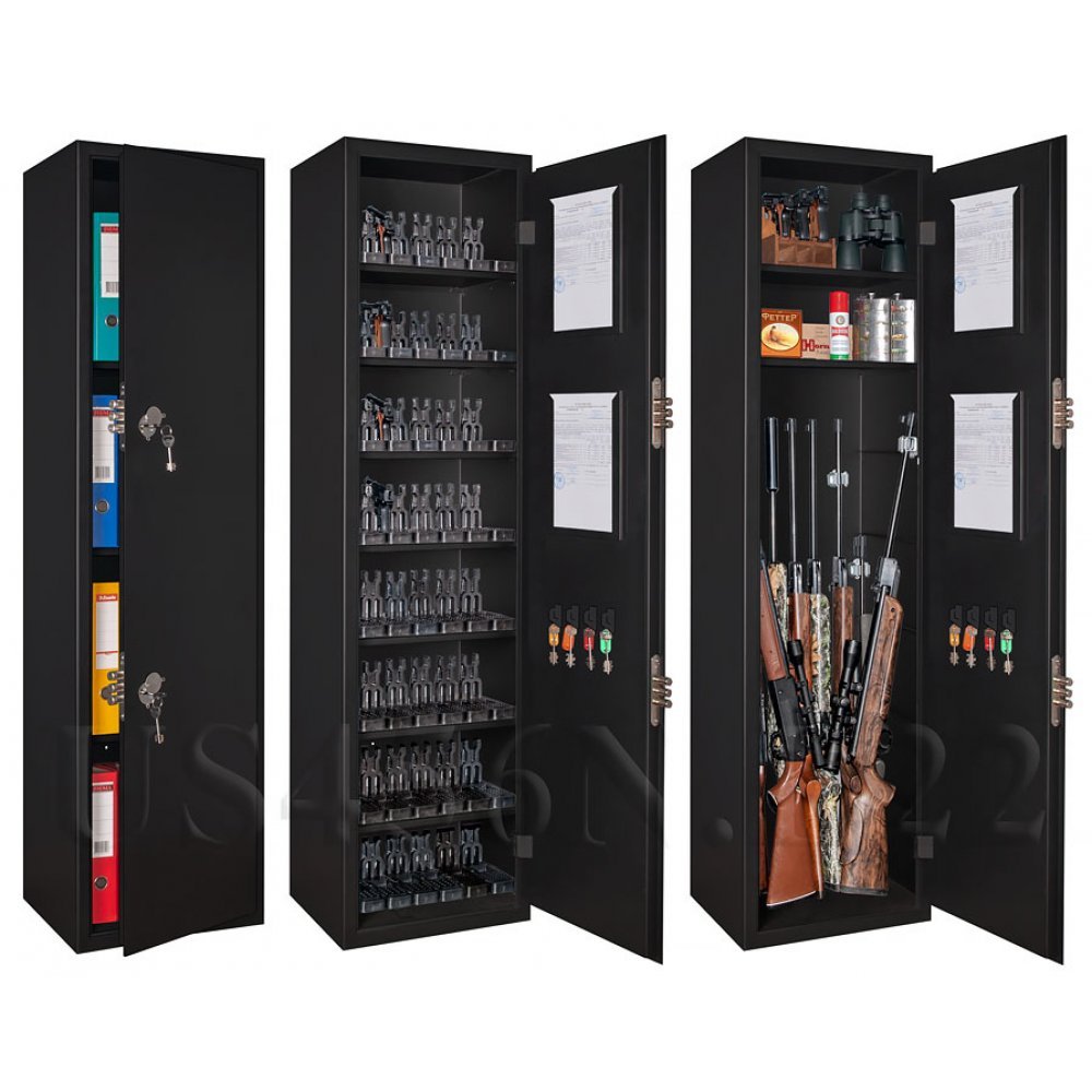 Предназначен для хранения большого количества пистолетов (до 56), боеприпасов, кроме того может использоваться как оружейный, личный, офисный, бухгалтерский сейф. Полностью удовлетворяет требованиям МВД к хранению оружия для юридических и физических лиц.