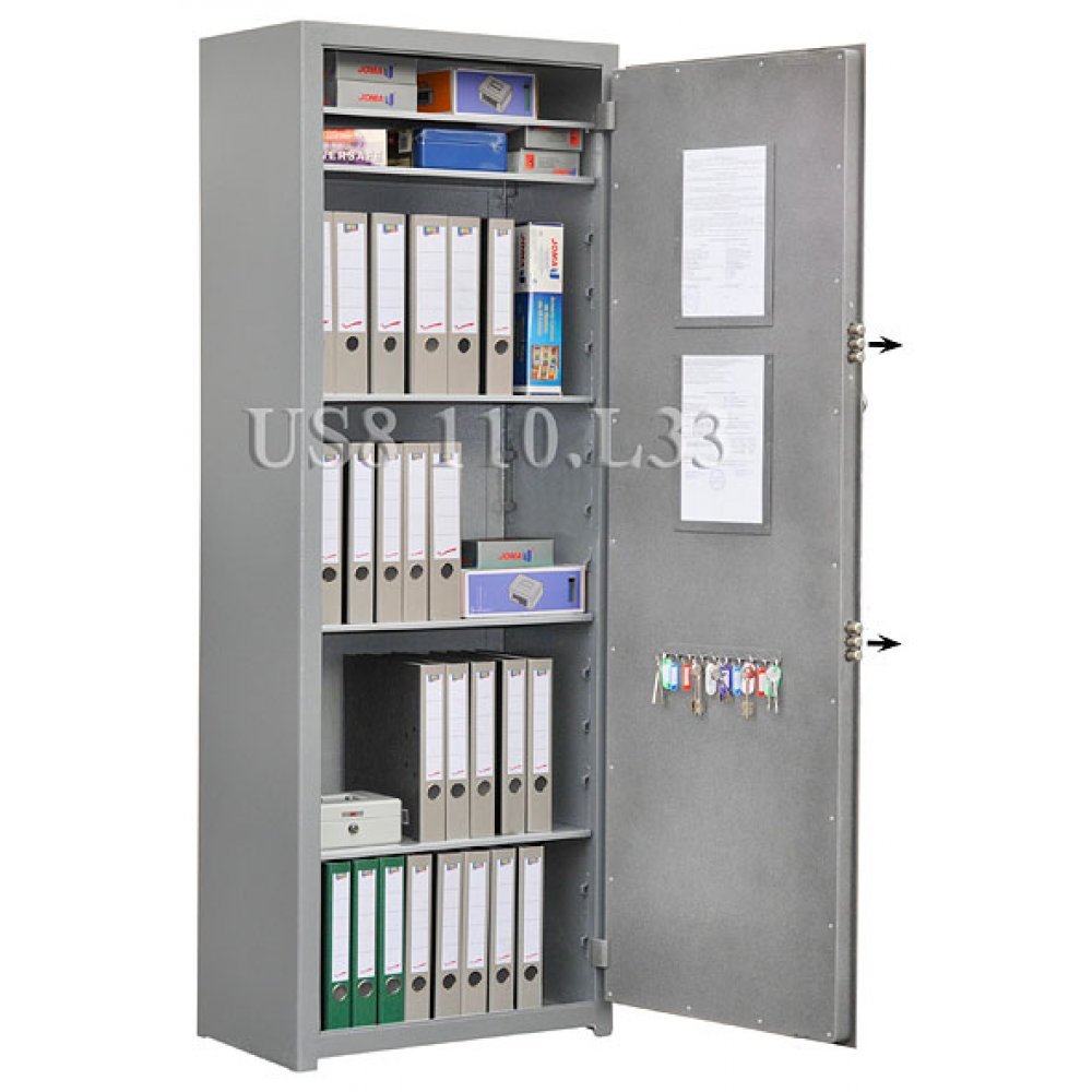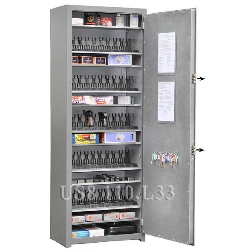 Базовая модель имеет 11 съемных полок с регулируемой высотой установки, но по желанию заказчика сейф может быть изготовлен с дополнительным внутренним запираемым отделением. На внутренней стороне двери сейфа имеются две рамки под списки личного состава (либо опись) и крючки для хранения ключей и т.п.