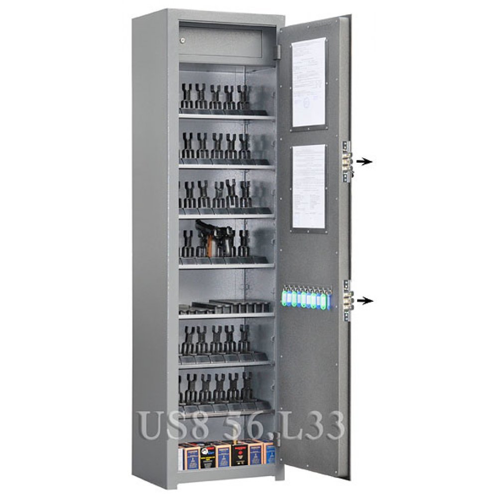 Внутреннее запираемое отделение и 7 съемных полок с регулируемой высотой установки. На внутренней стороне двери сейфа имеются две рамки под списки личного состава (либо опись) и крючки для хранения ключей и т.п.