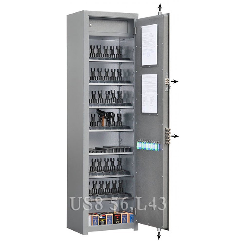 Внутреннее запираемое отделение и 7 съемных полок с регулируемой высотой установки. На внутренней стороне двери сейфа имеются две рамки под списки личного состава (либо опись) и крючки для хранения ключей и т.п.