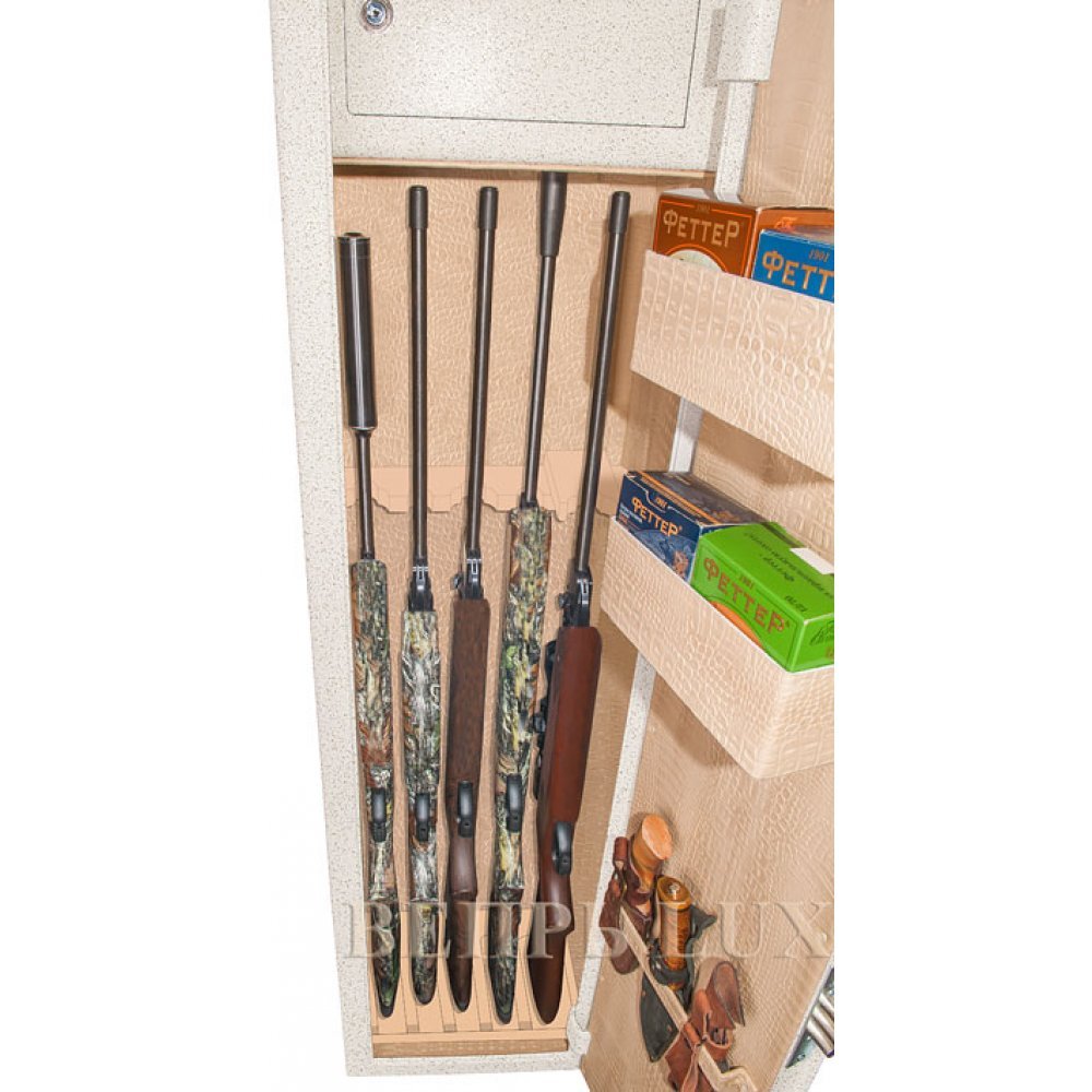 Сейф имеет внутреннее запираемое (патронное) отделение специальной конструкции, которая позволяет хранить в сейфе ружья, высота которых практически равна высоте сейфа. На внутренней поверхности двери имеются два удобных лотка для хранения коробок, пистолетов и т.п. Внутренняя поверхность двери также имеет держатель для хранения ножей, шомполов и т.п. Сейф оборудован нижними и верхними деревянными ложементами специальной удобной формы на пять стволов.