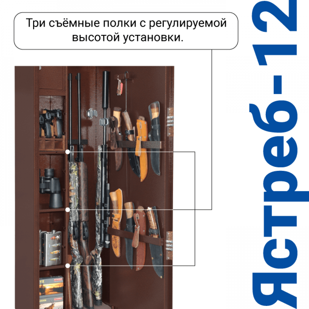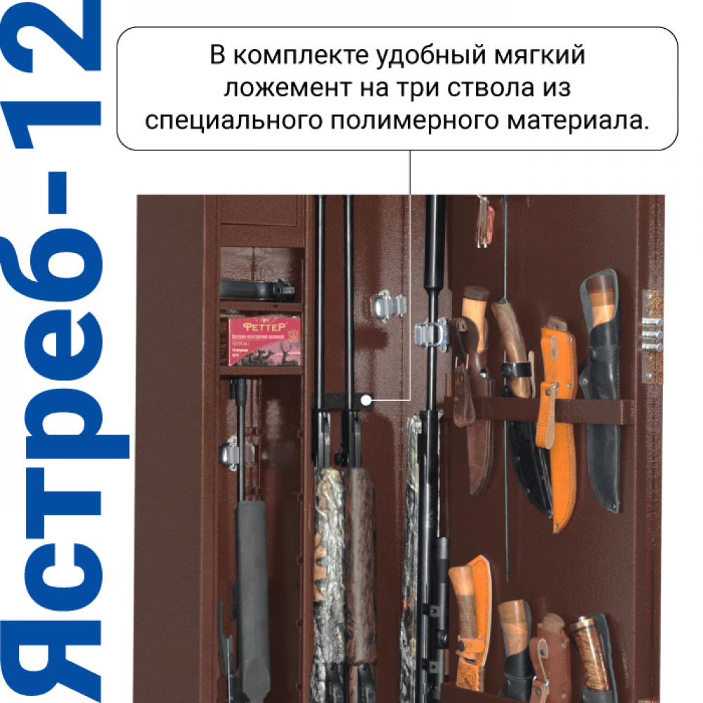 Внутреннее устройство оружейного сейфа: запираемое (патронное) отделение и 3 съемные регулируемые по высоте полки. На внутренней стороне двери этого оружейного сейфа есть держатели для хранения ножей и крючки для хранения шомполов, ключей и т.п. Ружья можно хранить как по одну сторону от перегородки, так и по обе стороны от перегородки. Дно оружейного сейфа отделано ковролином. Удобный мягкий ложемент на три ствола из специального полимерного материала в комплекте. Ложемент легко устанавливается в любое нужное место шкафа.