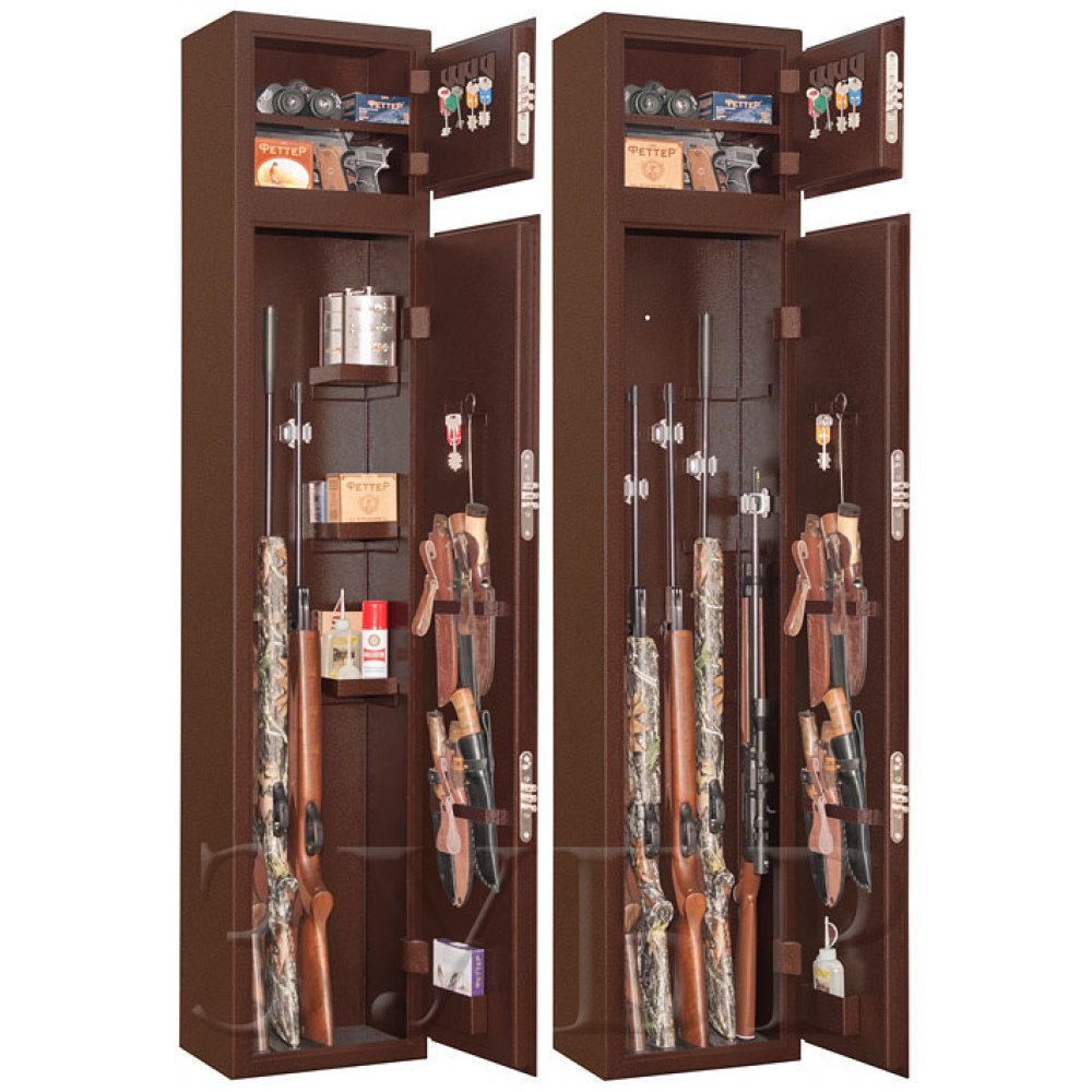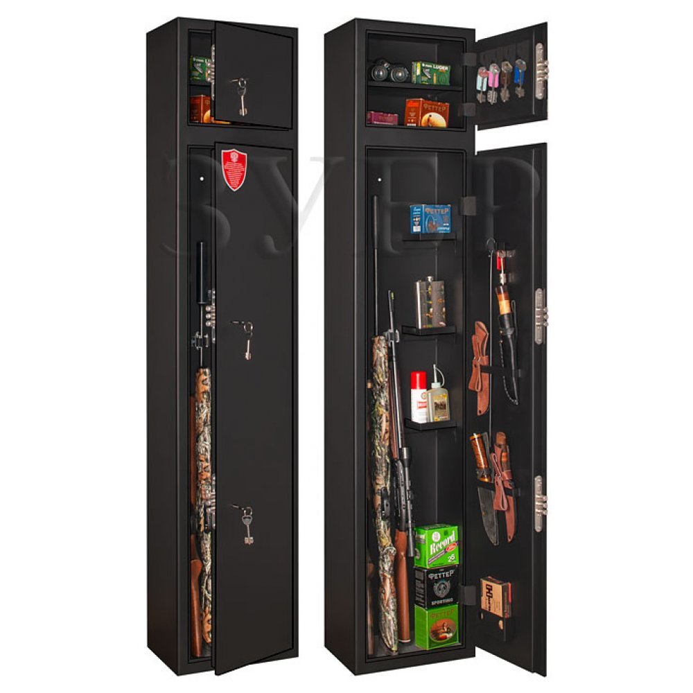 Двухсекционный оружейный сейф. Сейф полностью удовлетворяет требованиям МВД и Росгвардии к хранению оружия физическими и юридическими лицами. Толщина металла не менее 3 мм. Оснащен тремя сейфовыми замками второго класса. Оборудован удобными ложементами для хранения оружия. Имеются анкерные отверстия на задней стенке сейфа для крепления к стене.