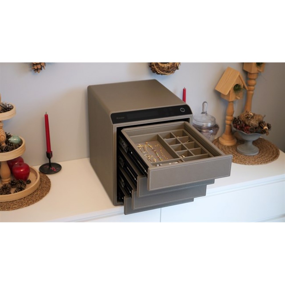 Сейф-шкатулка для ювелирных украшений - идеальное решение для хранения и драгоценностей. Сейф выполнен из металла, обтянутого высококачественной экокожей, что придает ему элегантный и изысканный вид. Сейф оснащен биометрическим замком, который открывается с помощью сканирования отпечатка пальца. Вы можете записать до 100 отпечатков в память устройства.