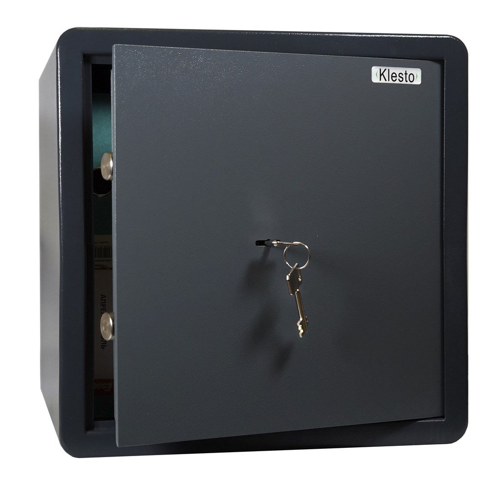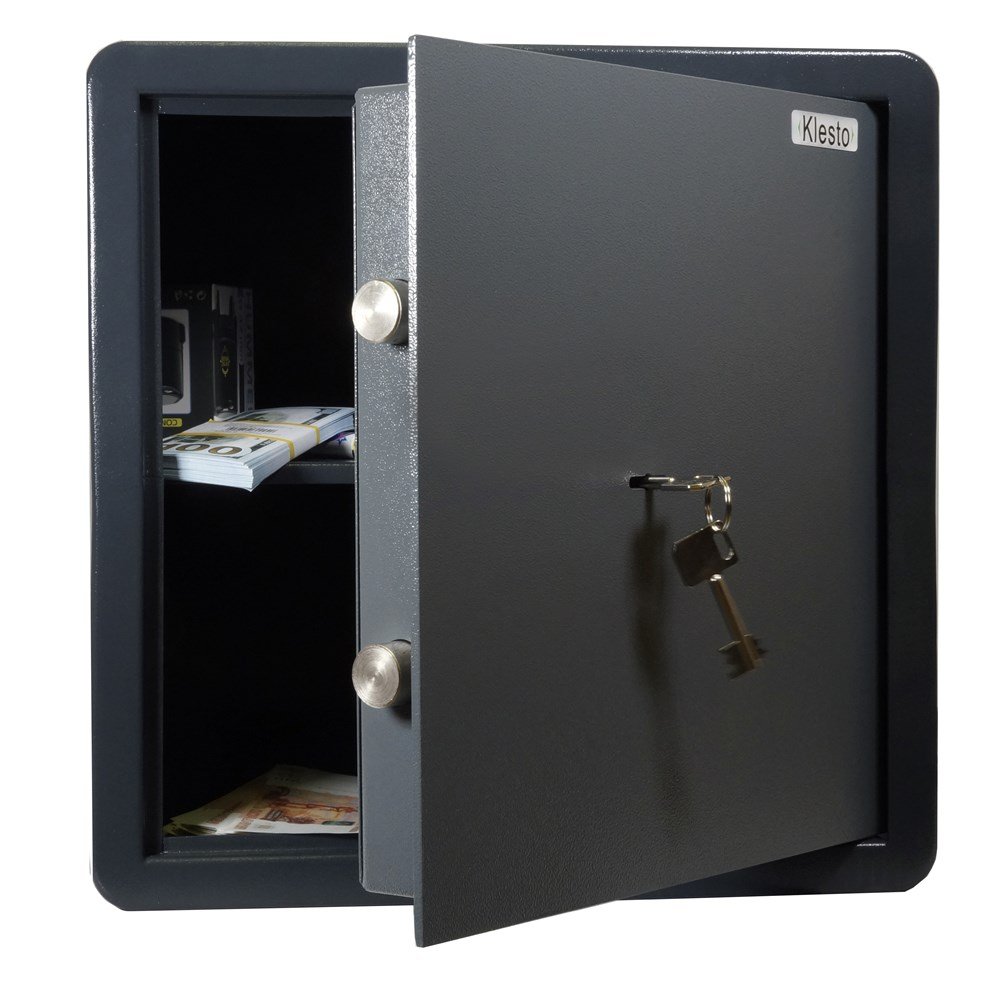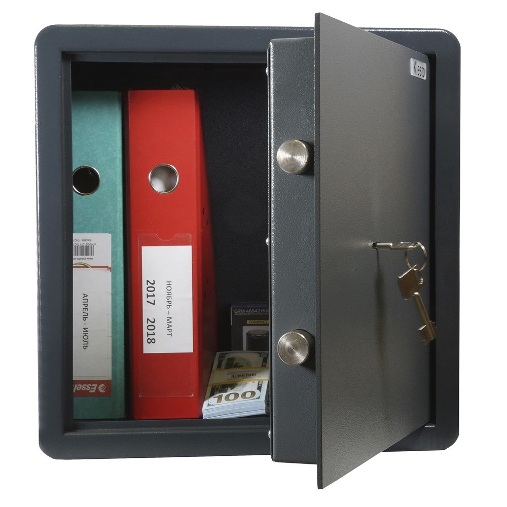 Сейф оборудован ключевым (серия K) или электронным замком с дополнительным аварийным ключом (серия EL ). Внутри сейфа находится съемная полочка ·, На поверхность сейфа нанесено двух цветное полимерное покрытие двух оттенков серого цвета. ·,