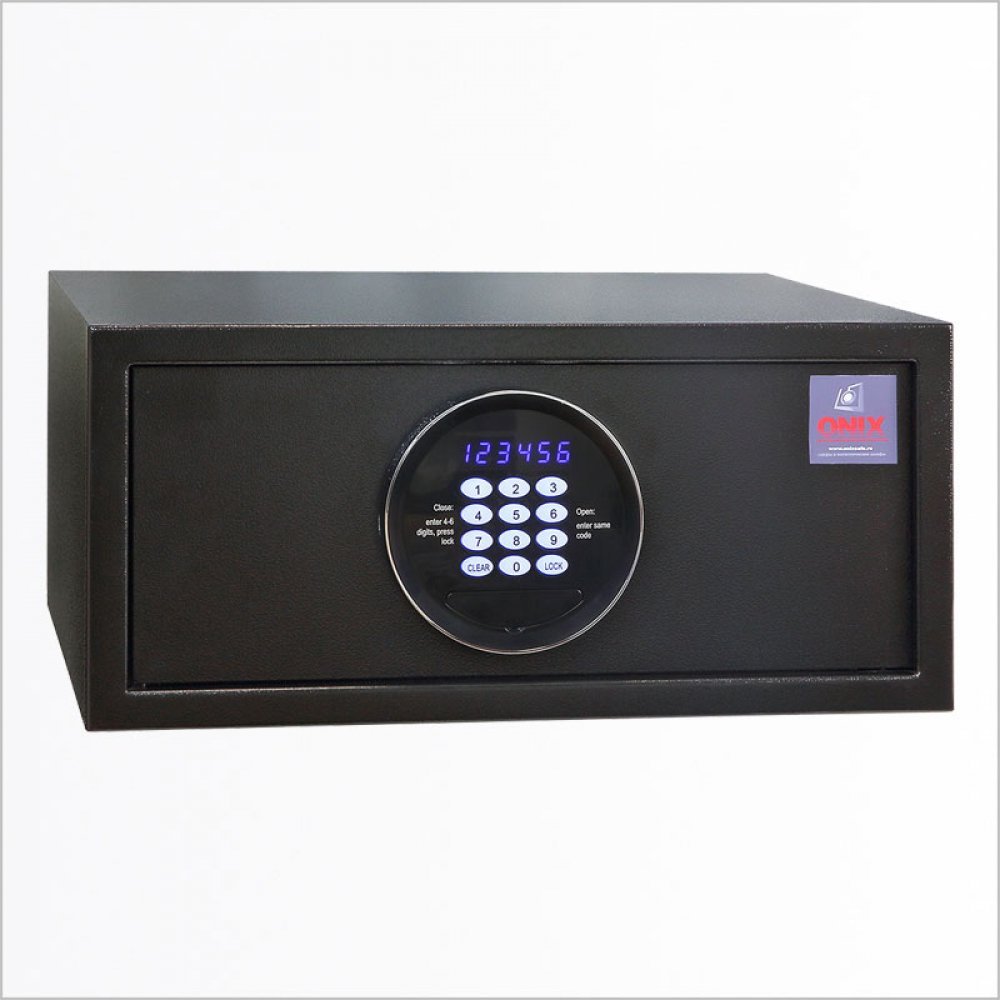 - Электронный замок мебельного сейфа Onix H-20/44E работает от батареек типа AA.