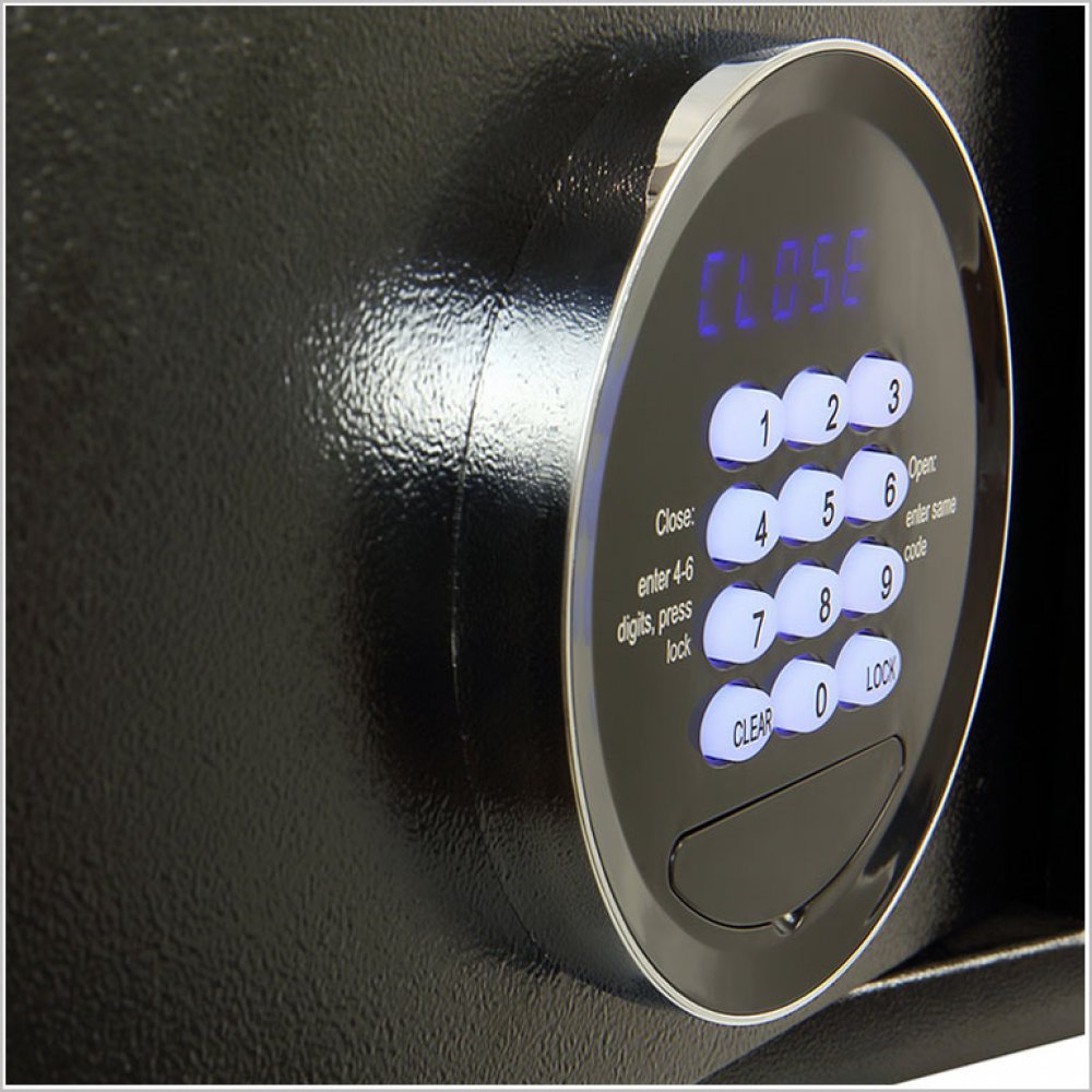- Дверь запирается электронным замком с двумя режимами работы: отельным и домашним. Отельный режим отличается функцией аренды, которая позволяет запрограммировать конкретное время пользования сейфом, по истечении которого все манипуляции, с замком сейфа, становятся невозможными.