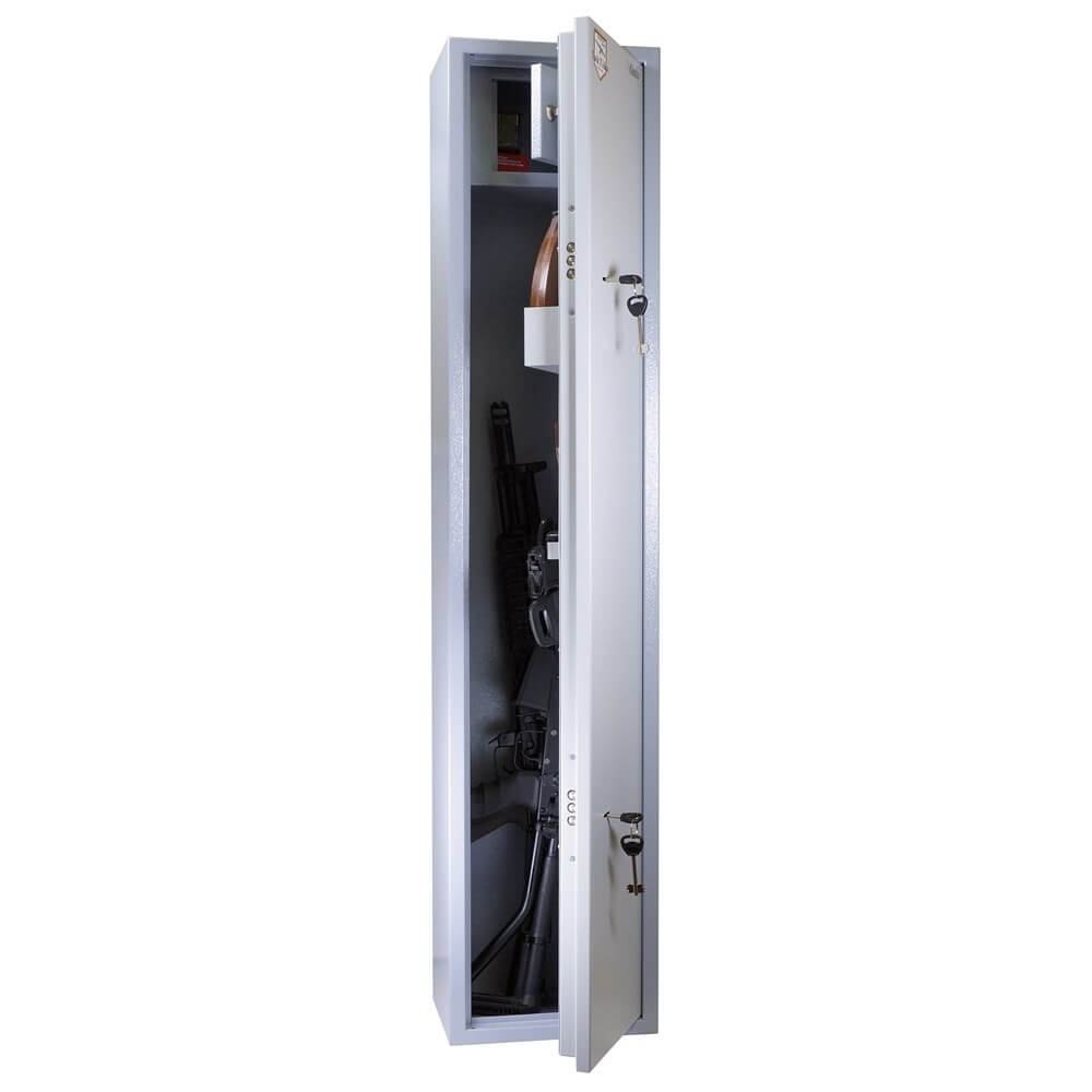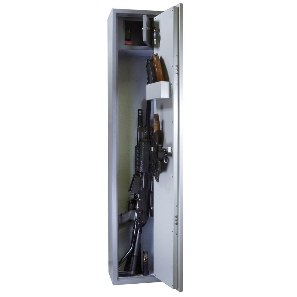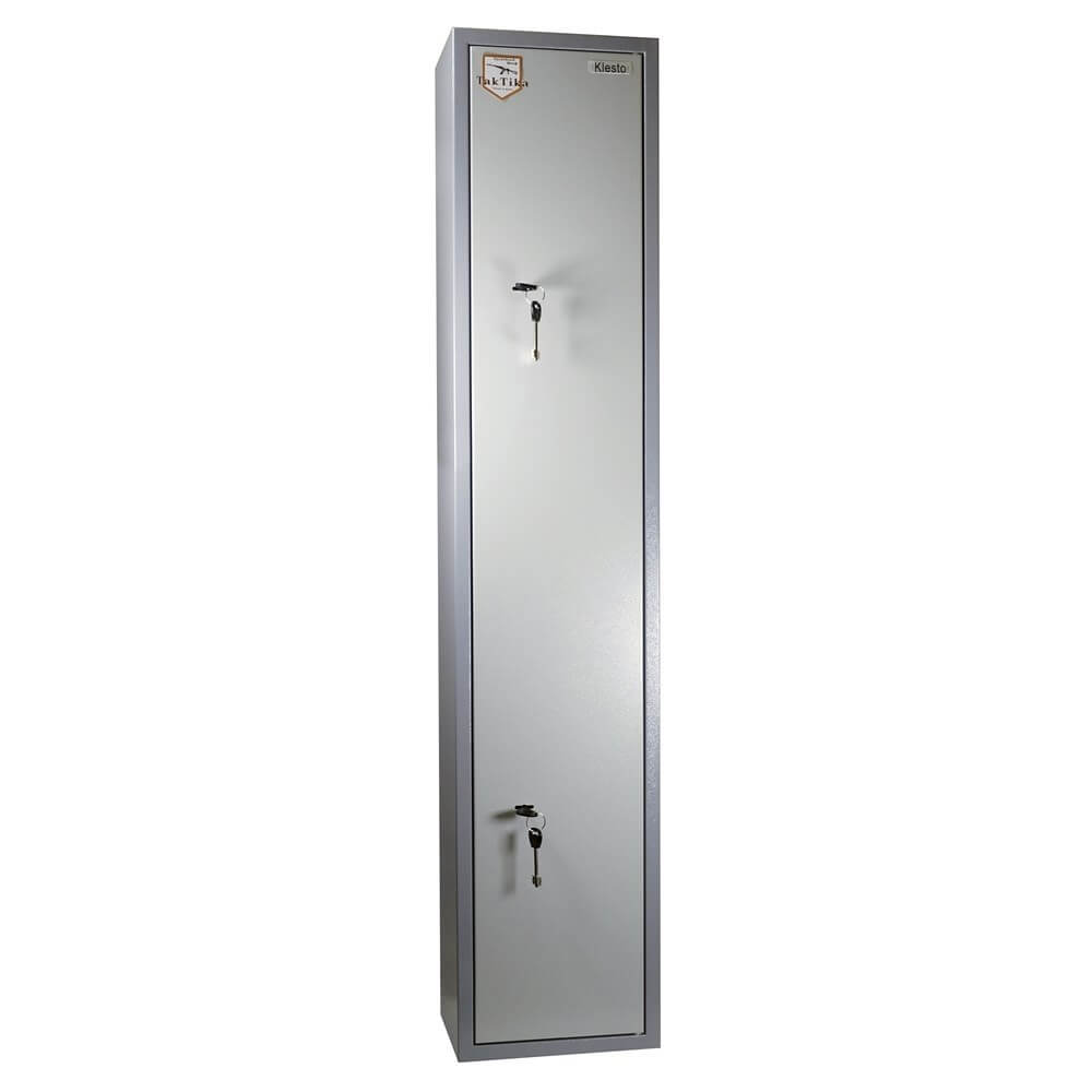Металлический оружейный шкаф TakTika 2013 оснащен двумя надежными сувальдными замками повышенной секретности с тремя ригелями. Сейф позволяет хранить до двух ружей. Сейф имеет запираемый на ключ встроенный ящик под патроны, съемный карман для аксессуаров, а также скобу для инвентаря. Предусмотрены отверстия для крепления к полу и стене. Мягкий коврик позволит аккуратно и бережно устанавливать ружье без риска повредить приклад. Дверь усилена металлическим коробом, который не только закрывает замки, но и обеспечивает дополнительную жесткость конструкции, а так же позволяет перевешивать дверь справа налево. Максимальная длина оружия, размещаемого в сейфе -1120 мм. Шкаф покрашен износостойкой порошковой краской.