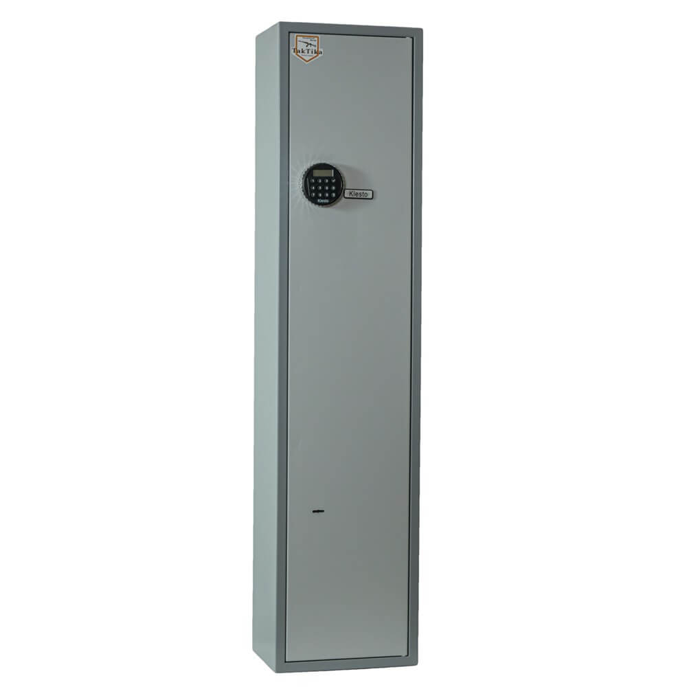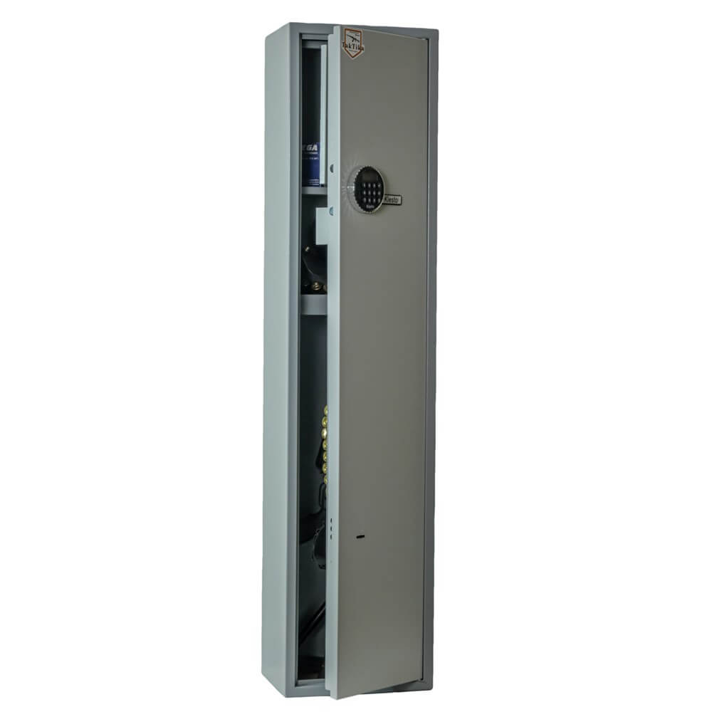 Металлический оружейный шкаф TakTika 2313EL с комбинацией электронного замка и сувальдного замка повышенной секретности с тремя ригелями позволяет хранить до двух ружей с дополнительными аксессуарами. Электронный замок с подсветкой дисплея имеет возможность программирования двух кодов пользователя. Работает от 4 батареек типа АА. Вы можете запирать оружейный шкаф только на электронный замок, и, если необходимо, дополнительно запирать на нижний ключевой замок.