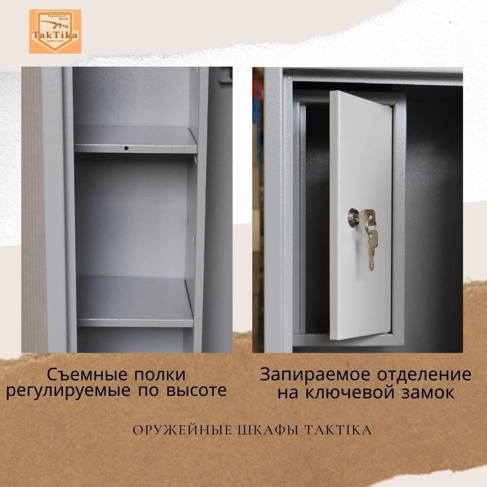 Оружейный шкаф TakTika 2313EL имеет запираемый на ключ встроенный ящик под патроны, съемный карман для аксессуаров, сварную полку, а также скобу для инвентаря. Предусмотрены отверстия для крепления к полу и стене. Шкаф укомплектован съемными резиновыми держателями, что позволяет крепко зафиксировать ствол ружья исключая смещение оружия внутри шкафа. Мягкий коврик позволит аккуратно и бережно устанавливать ружье без риска повредить приклад. Дверь усилена металлическим коробом, который не только закрывает замки, но и обеспечивает дополнительную жесткость конструкции. Максимальная длина оружия, размещаемого в сейфе - 1295 мм. Высота от пола до трейзера - 800 мм. Шкаф покрашен износостойкой порошковой краской.