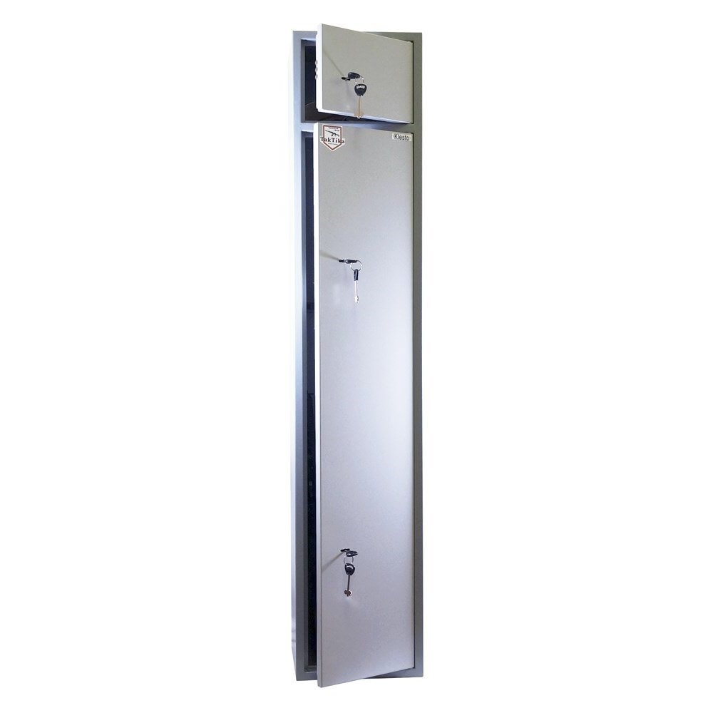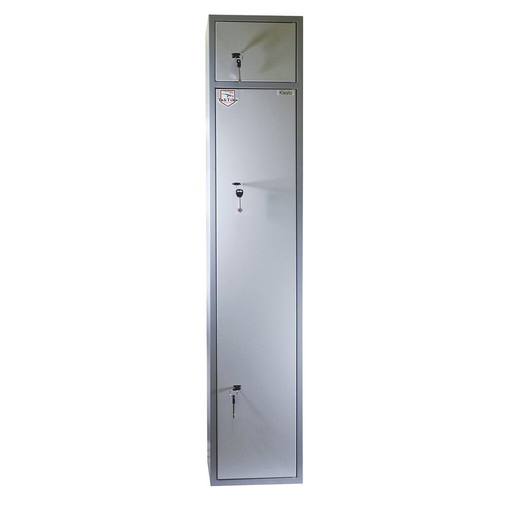 Металлический оружейный шкаф TakTika 2515 оснащен двумя надежными сувальдными замками повышенной секретности с тремя ригелями. Сейф позволяет хранить до трех ружей с дополнительными аксессуарами. Особенностью шкафа является независимое запираемое отделение с ключевым сувальдным замком, съемный карман для аксессуаров и сварная скоба для инвентаря. Предусмотрены отверстия для крепления к полу и стене. Шкаф укомплектован съемными резиновыми держателями, что позволяет крепко зафиксировать ствол ружья исключая смещение оружия внутри шкафа. Мягкий коврик позволит аккуратно и бережно устанавливать ружье без риска повредить приклад. Дверь усилена металлическим коробом, который не только закрывает замки, но и обеспечивает дополнительную жесткость конструкции, а так же позволяет перевешивать дверь справа налево. Максимальная длина оружия, размещаемого в сейфе - 1260 мм. Шкаф покрашен износостойкой порошковой краской.