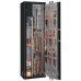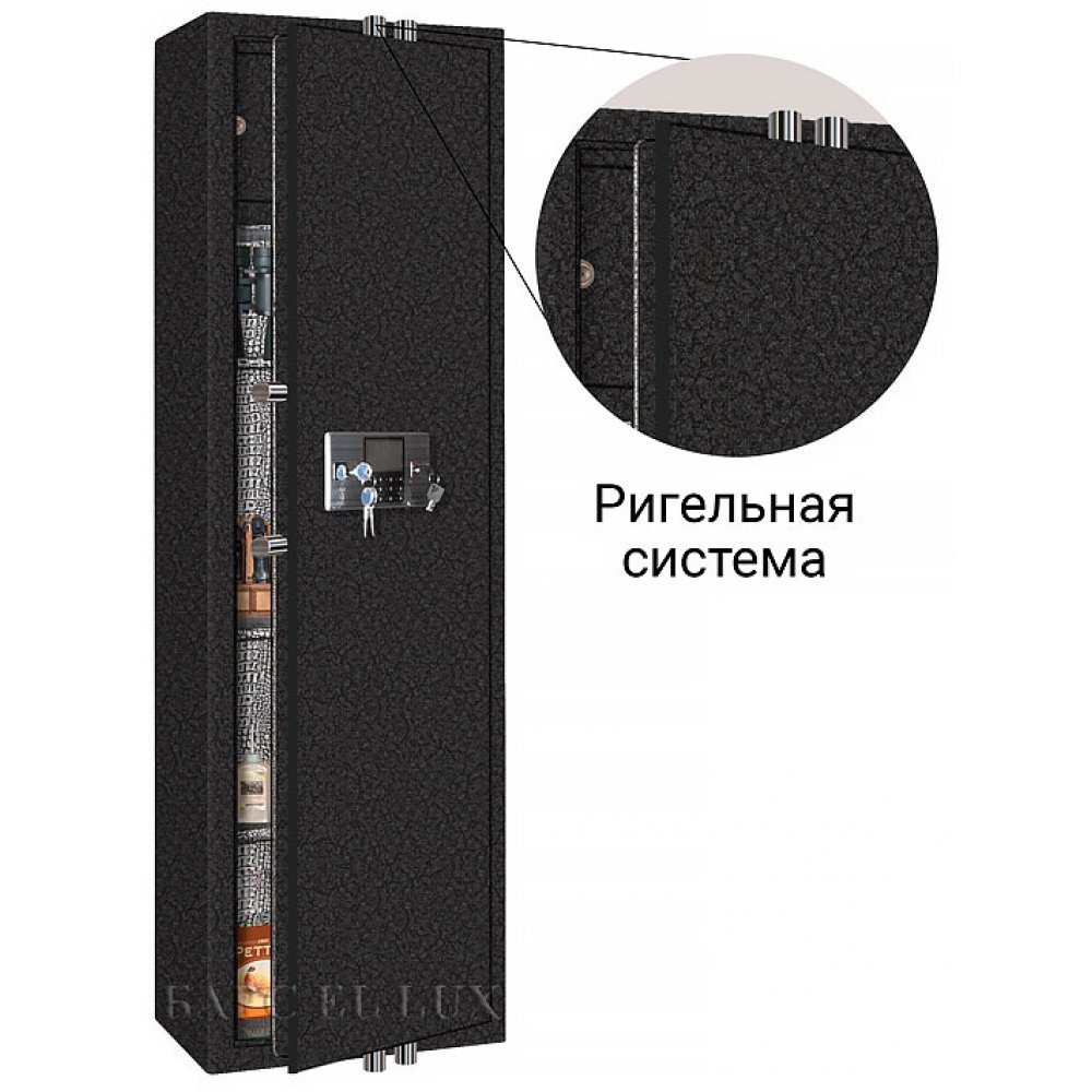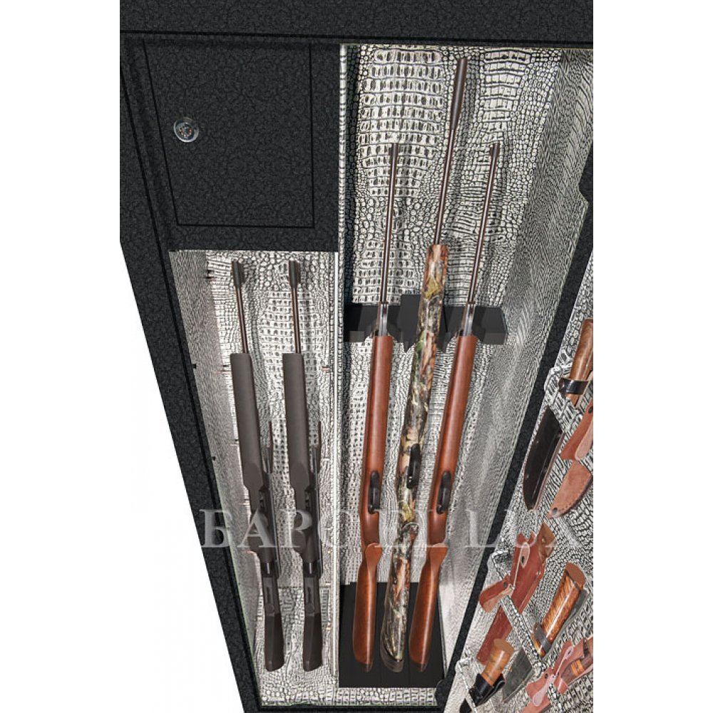 Сейф полностью удовлетворяет требованиям Росгвардии к хранению оружия физическими лицами. Оснащен электронным кодовым сейфовым замком. Оборудован удобными ложементами для хранения оружия. На внутренней поверхности двери сейфа имеются рамки для хранения ножей. Имеются отверстия на задней стенке сейфа для крепления к стене. Прочная порошковая краска защищает сейф от коррозии. Модель имеет полную внутреннюю мягкую отделку искусственной кожей.