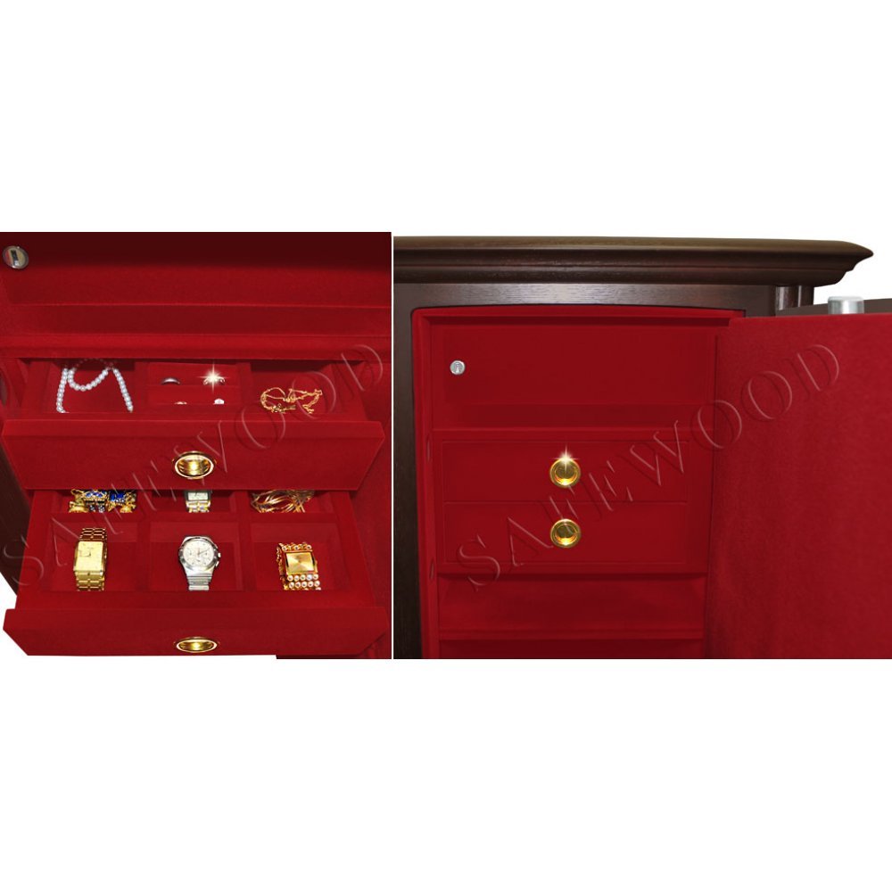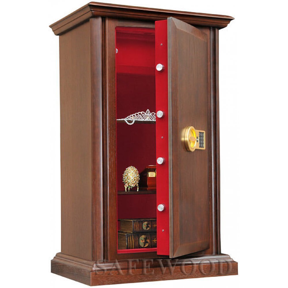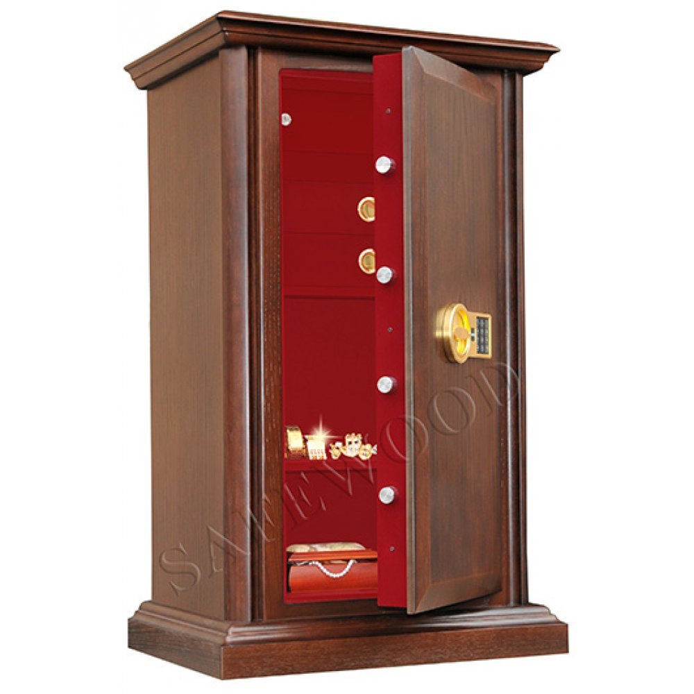 Элитный взломоогнестойкий сейф с отделкой натуральным деревом. Вся внутренняя поверхность сейфа имеет престижное мягкое покрытие флокированием бархатом. Сейф сертифицирован на устойчивость к взлому – 1 класс. Умеренная огнестойкость – приблизительно 20Б. Корпус имеет двойные стальные стенки, межстеночный наполнитель – бетон. Металлические детали сейфа имеют гигиенически-безопасное, коррозионно-стойкое полимерно-порошковое покрытие на основе материалов производства ЕС. В отличие от других сейфов с отделкой деревом, сейфы Safewood являются Взломоогнестойкими сейфами.