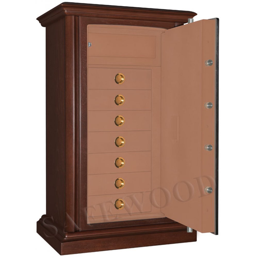 Элитный взломоогнестойкий сейф с отделкой натуральным деревом. Вся внутренняя поверхность сейфа имеет престижное мягкое покрытие флокированием бархатом. Сейф сертифицирован на устойчивость к взлому – 1 класс. Умеренная огнестойкость – приблизительно 20Б. Корпус имеет двойные стальные стенки, межстеночный наполнитель – бетон. Металлические детали сейфа имеют гигиенически-безопасное, коррозионно-стойкое полимерно-порошковое покрытие на основе материалов производства ЕС. В отличие от других сейфов с отделкой деревом, сейфы Safewood являются Взломоогнестойкими сейфами.