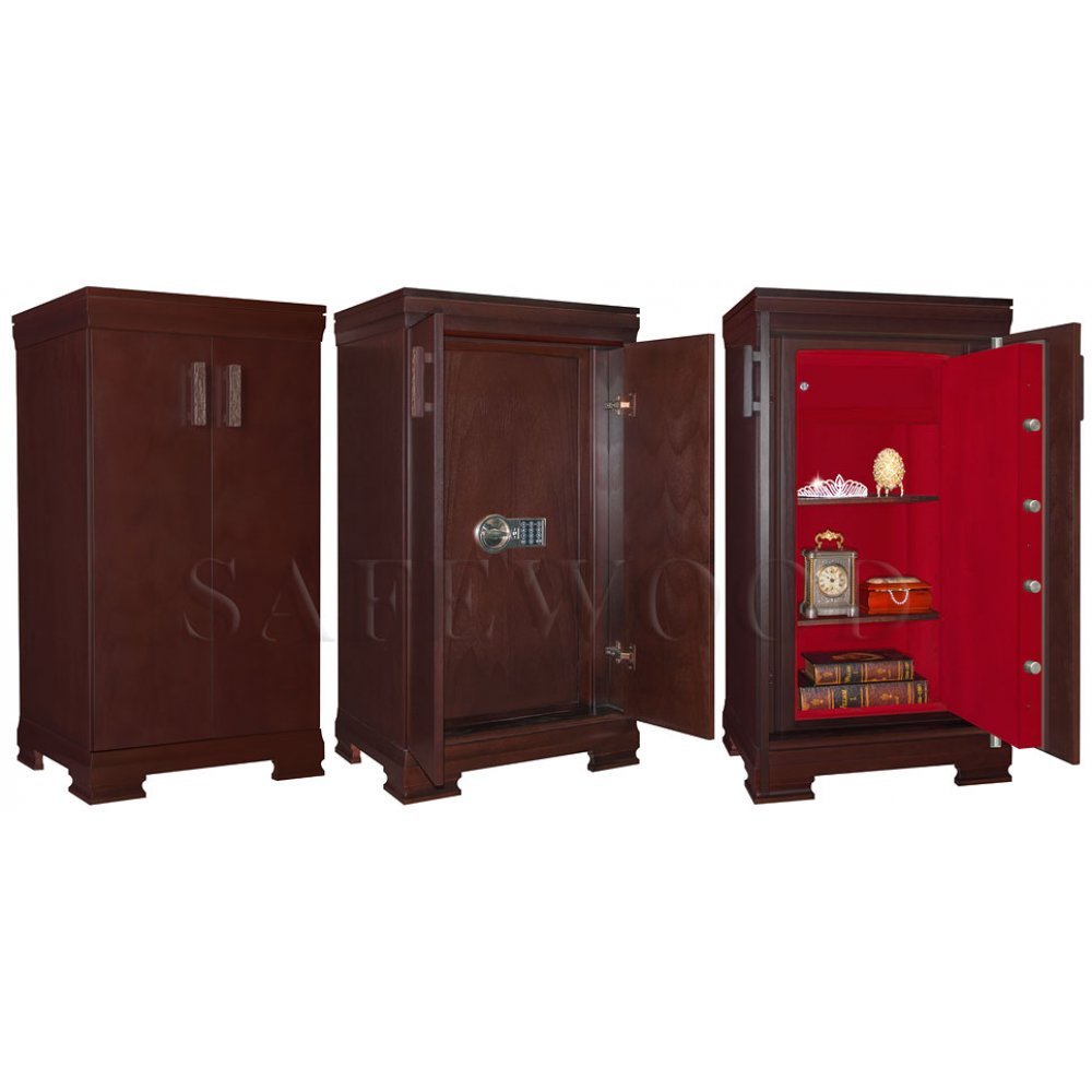 Скрытое исполнение. Имеет две дополнительные наружные мебельные двери, за которыми скрыт непосредственно сам сейф. Снаружи изделие выглядит как деревянный мебельный шкаф. Элитный взломоогнестойкий сейф с отделкой натуральным деревом. Вся внутренняя поверхность сейфа имеет престижное мягкое покрытие флокированием бархатом. Сейф сертифицирован на устойчивость к взлому – 1 класс. Умеренная огнестойкость – приблизительно 20Б. Корпус имеет двойные стальные стенки, межстеночный наполнитель – бетон. Металлические детали сейфа имеют гигиенически-безопасное, коррозионно-стойкое полимерно-порошковое покрытие на основе материалов производства ЕС. В отличие от других сейфов с отделкой деревом, сейфы Safewood являются Взломоогнестойкими сейфами.