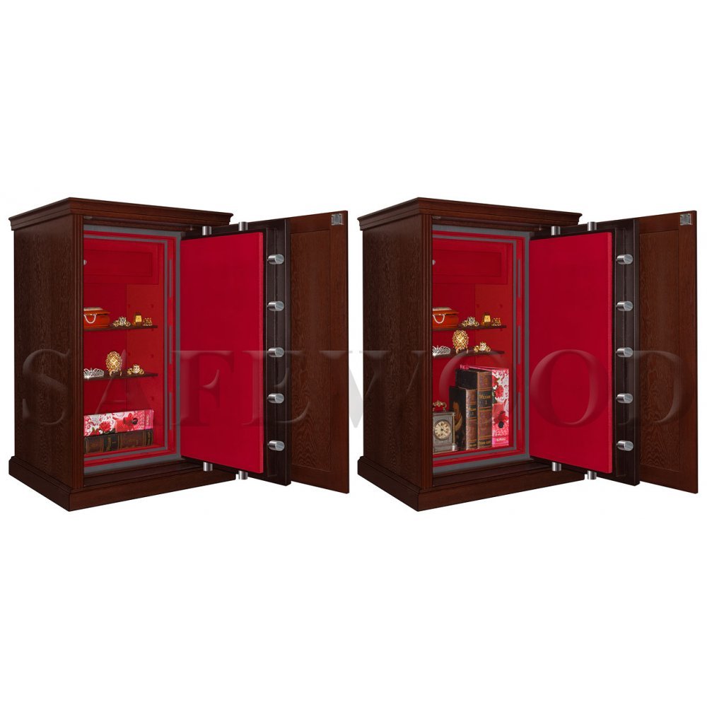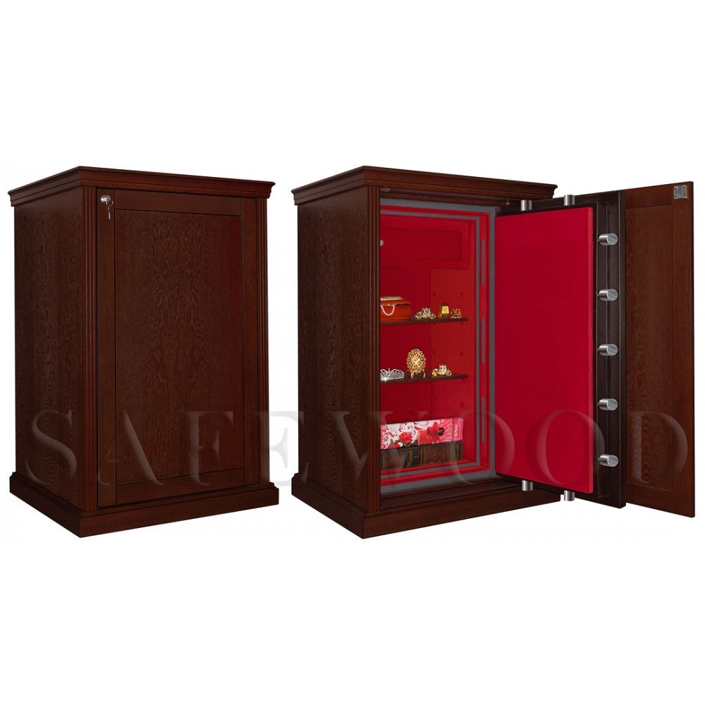 Уникальный, не имеющий мировых аналогов элитный сейф с отделкой натуральным деревом. Скрытое исполнение. Сейф выполнен в виде мебельной тумбы. Имеет дополнительную наружную мебельную дверь, за которой скрыт непосредственно сам сейф. Сейф сертифицирован на устойчивость к взлому по II классу, а также имеет высокую огнестойкость – сертификат по классу огнестойкости 60Б. Вся внутренняя поверхность сейфа имеет престижное мягкое покрытие флокированием бархатом. В отличие от других сейфов с отделкой деревом, сейфы Safewood являются Взломоогнестойкими элитными сейфами. Одобрено в Евросоюзе, сертификат ESSA(Германия).