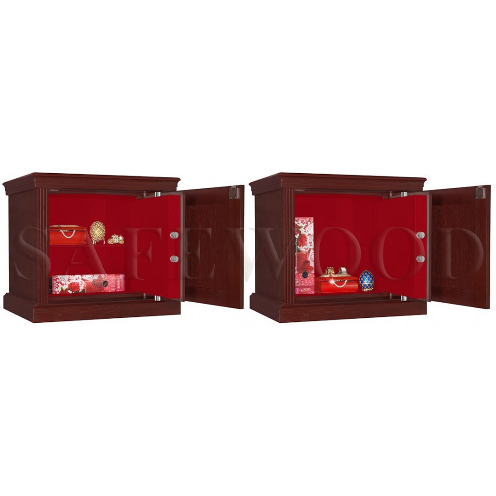 Скрытое исполнение. Сейф выполнен в виде мебельной тумбы. Имеет дополнительную наружную мебельную дверь, за которой скрыт непосредственно сам сейф. Элитный взломоогнестойкий сейф с отделкой натуральным деревом. Вся внутренняя поверхность сейфа имеет престижное мягкое покрытие флокированием бархатом. Сейф сертифицирован на устойчивость к взлому – 1 класс. Умеренная огнестойкость – приблизительно 20Б. Корпус имеет двойные стальные стенки, межстеночный наполнитель – бетон. Металлические детали сейфа имеют гигиенически-безопасное, коррозионно-стойкое полимерно-порошковое покрытие на основе материалов производства ЕС. В отличие от других сейфов с отделкой деревом, сейфы Safewood являются Взломоогнестойкими сейфами.