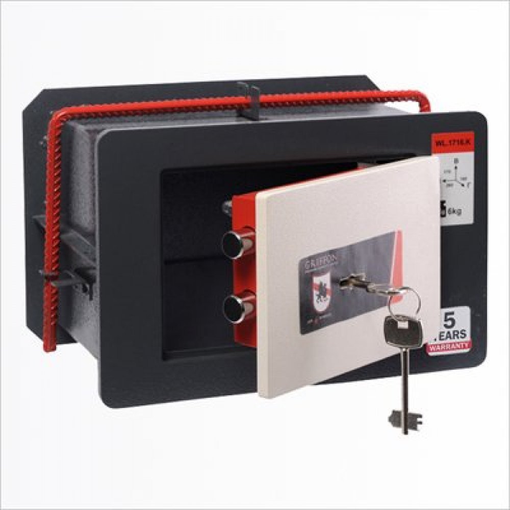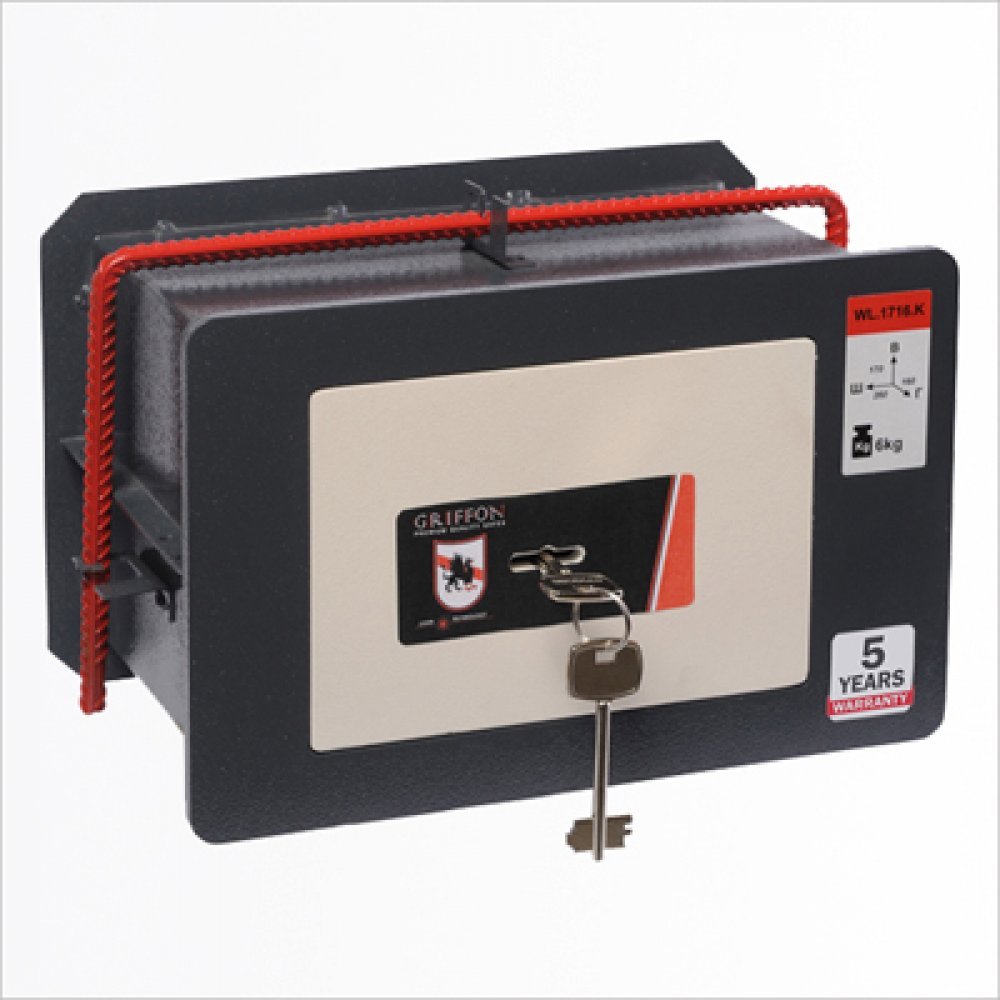 . Очень легкий сейф, который, однако, при правильной установке в заранее подготовленную нишу способен дать серьезный отпор ворам. Толщина лицевой части составляет 8 мм. Данная модель оснащена ключевым замком, приводящим в действие ригельную систему запирания.