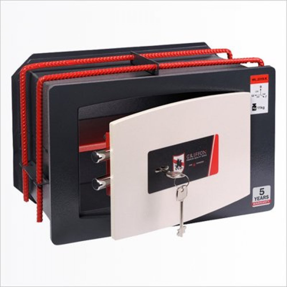 Встраиваемый сейф для дома с ключевым сувальдным замком. Сейф устанавливается в заранее подготовленной нише и крепится специальной арматурой, обеспечивающей его сохранность. Толщина лицевой стороны сейфа равна 8 мм. Внутри сейфа находится съемная полка. В дверь установлен ключевой сувальдный замок с 2 ригелями.