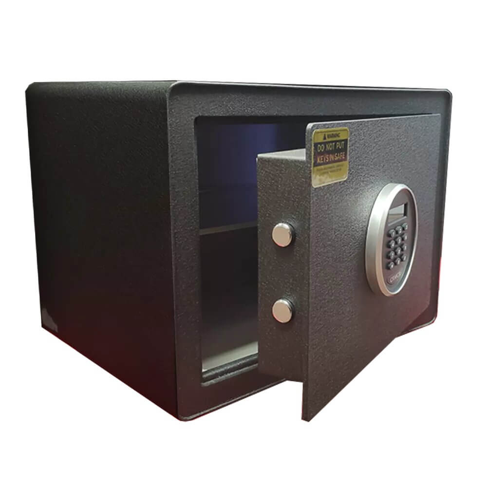 Сейф оснащен электронным замком с 6 цифрами в комбинации, вероятность взлома пароля оценивается приблизительно величиной 106, поэтому устройство отлично защищено от несанкционированного доступа. Сейфы с электронными замками намного удобнее и быстрее аналогичных сейфов с механическими замками, так как ключ не придется носить с собой. Нужно лишь ввести правильный пароль, состоящий из 6 цифр, и дверца сейфа откроется пользователям
