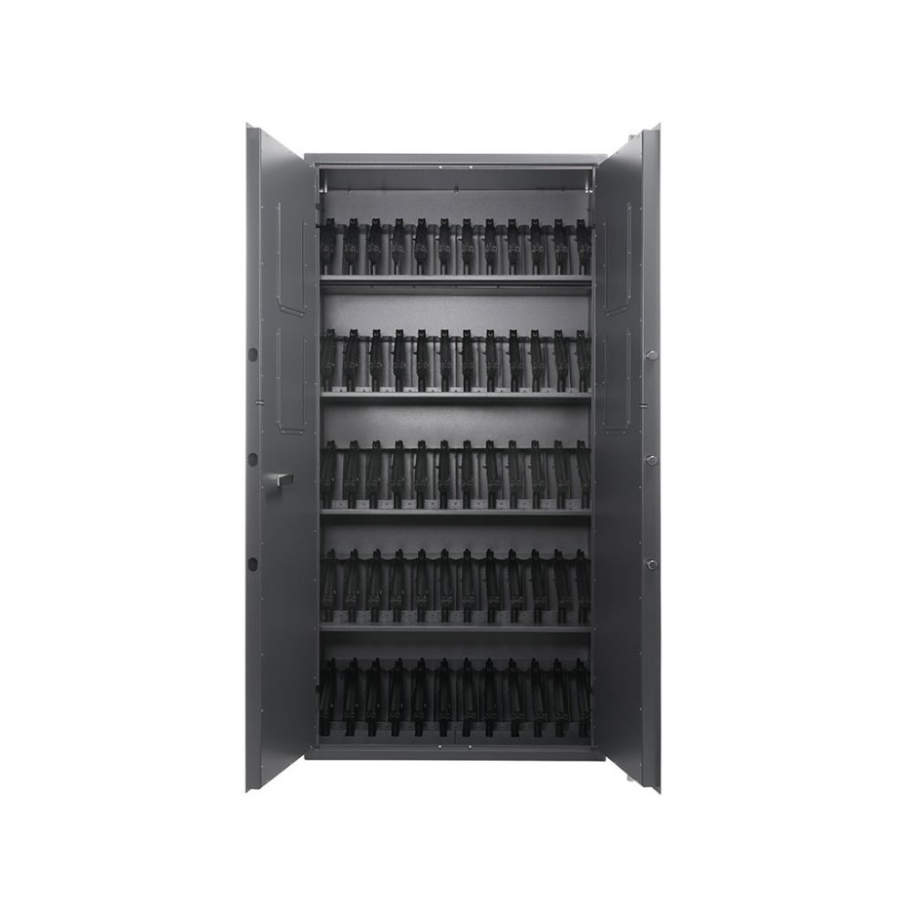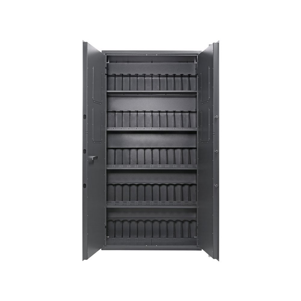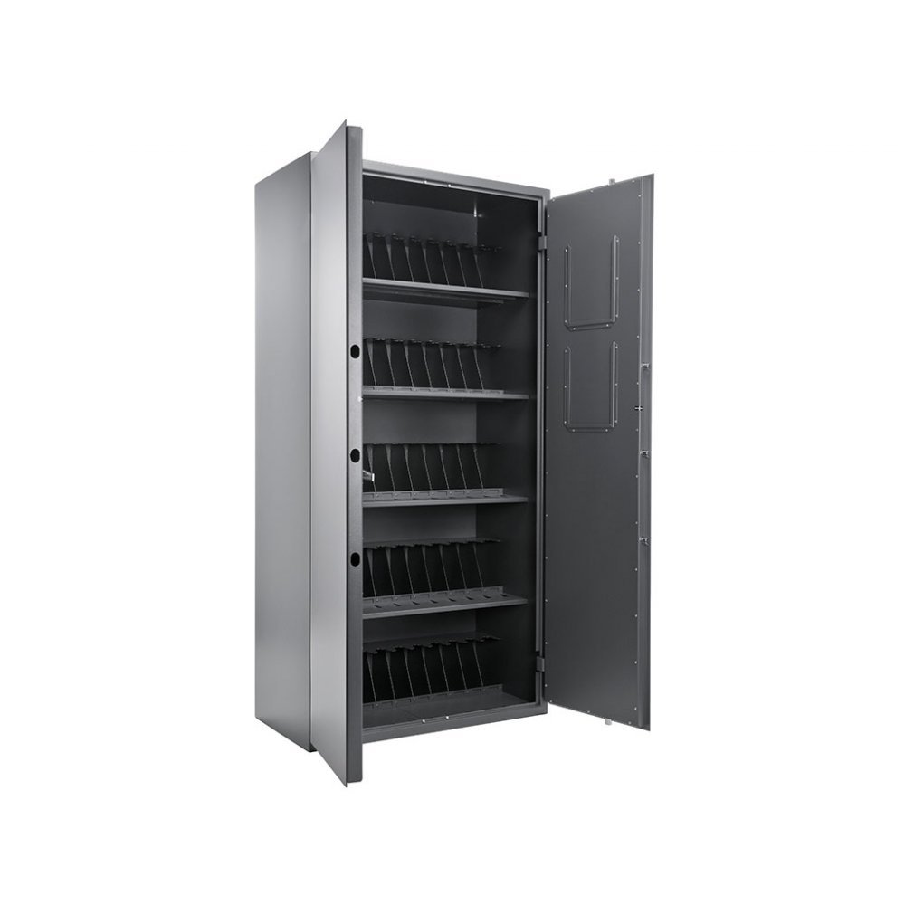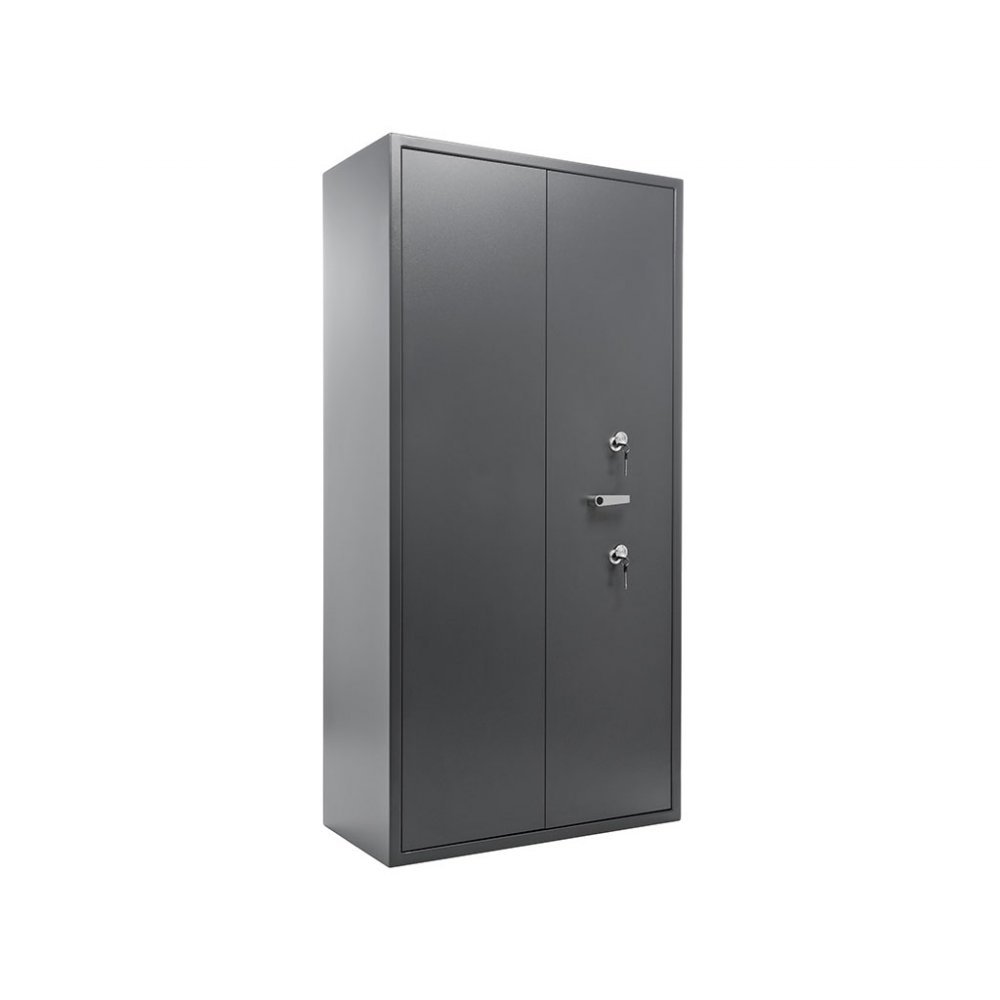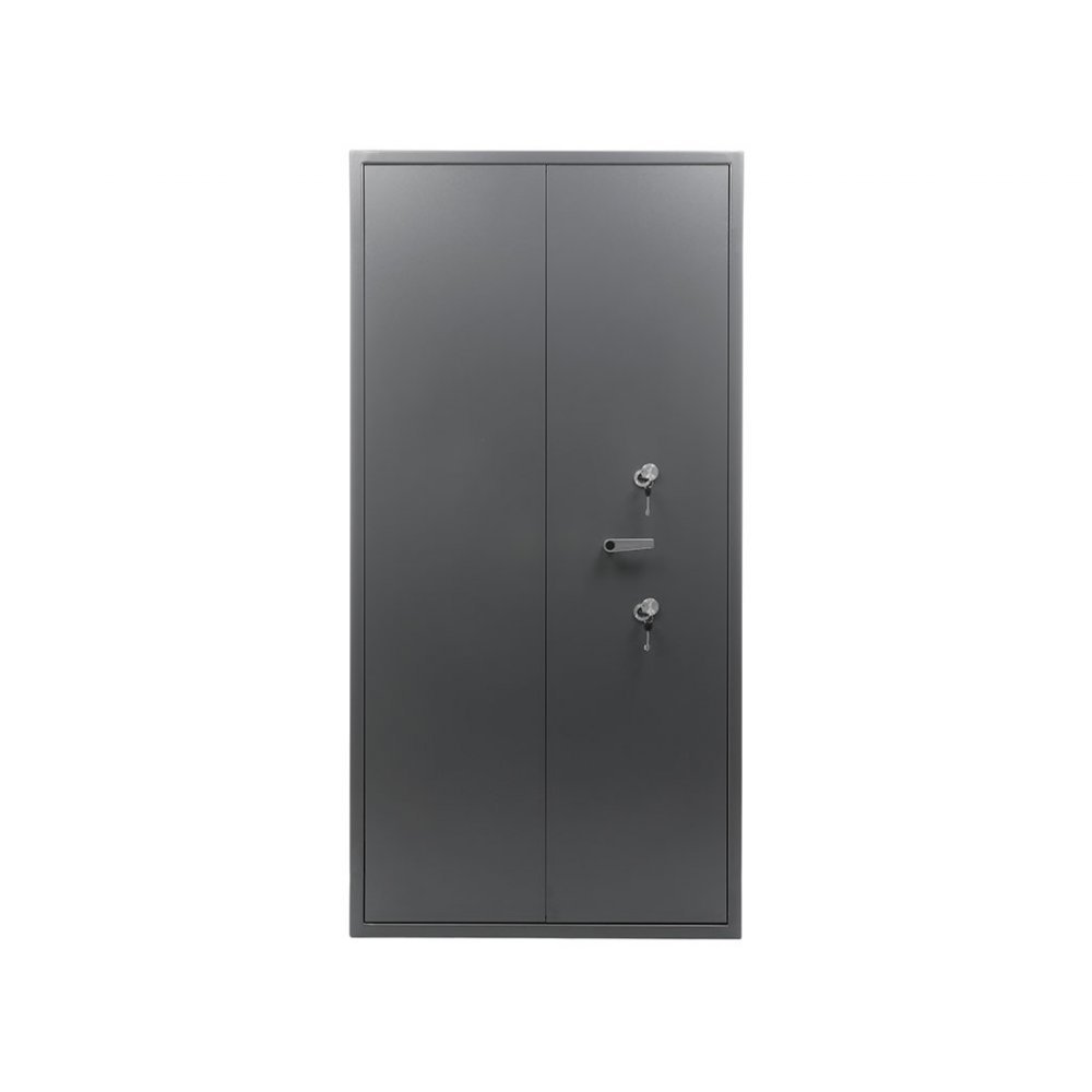 Предназначен для хранения 60 автоматов ПП-91 «Кедр» Шкаф сертифицирован. Класс устойчивости к взлому S2 по ГОСТ 55148-2012 Полностью соответствует требованиям МВД для хранения оружия Приказ №288 МВД РФ от 12.04.1999 г, Законом об оружии 150 ФЗ от 13.11.96г. , Постановлению правительства №814 от 21.07.1998 г. Сварной корпус, толщина стали 3 мм 3-сторонняя ригельная система запирания. Внутренние петли. Пассивные противовзломные ригеля Комплектуются двумя ключевыми сувальдными замками класс 2 ГОСТ 5089-2011 (по 2 ключа от каждого замка в комплекте) с опечатывающими устройствами. Поворотная ручка для удобства открывания и закрывания. Левая створка двери оборудована двумя подпружиненными самозапирающимися защелками (вверх и вниз) с приводом от ручки находящейся на внутренней стороне створки двери На внутренних сторонах дверей размещены 4 рамки для описи формата А4 Конструкция полок обеспечивает гарантированно надежное и устойчивое положение за счет собственного веса оружия. Обеспечивает долговечность эксплуатации за счет отсутствия обжимных роликов На каждой полке имеются карманы под шильды для маркировки Анкерные отверстия для крепления шкафа к полу и к стене Поставляется в собранном виде Дополнительные опции под заказ возможно оснастить шкаф подставкой с четырьмя неповоротными чугунными колесами (допускаемая нагрузка на колесо 200 кг.) и четырьмя регулируемыми винтовыми опорами. Подставка имеет два проема для перемещения шкафа подъемными устройствами возможно разместить две рамки под опись на внешней стороне двери Инструкции и сертификаты Сертификат соответствия Ростест