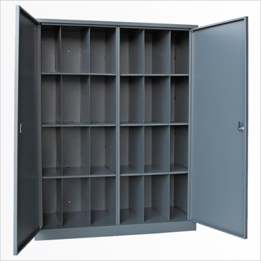 Металлический шкаф для противогазов с открытыми ячейками закрывается на 2 двери с ключевыми замками. Секции армейского шкафа расположены таким образом, чтобы сократить время, требуемое на извлечение противогазов – постоянная готовность к выдаче в максимально сжатые сроки. Прочная и устойчивая конструкция не деформируется в ходе эксплуатации. Толщина металла, используемого в лицевой панели и боковых стенках равна 1,2 мм.